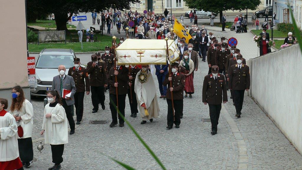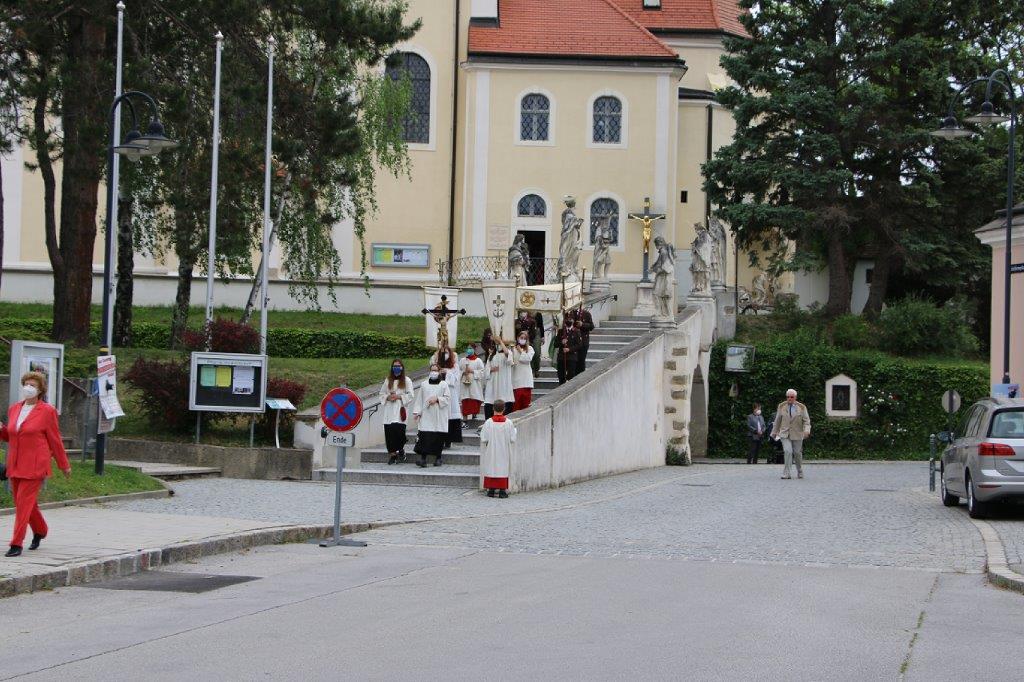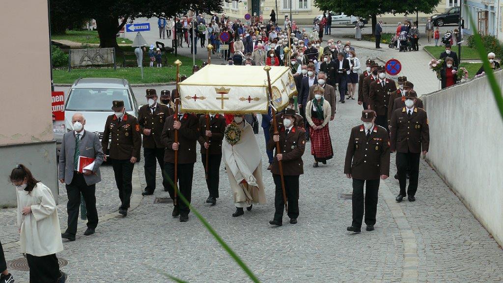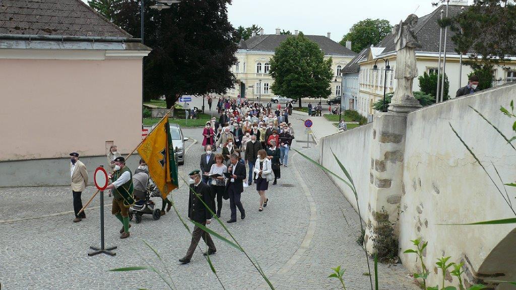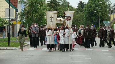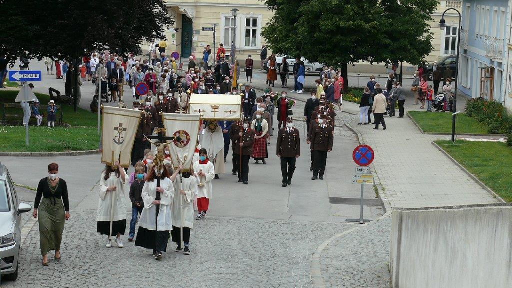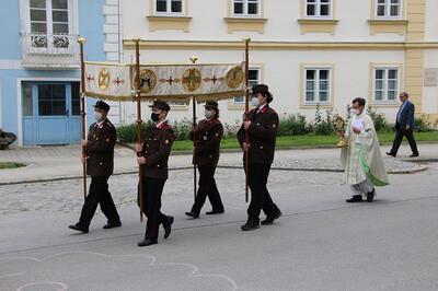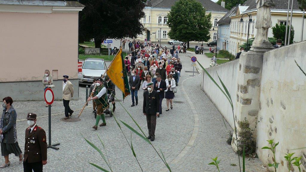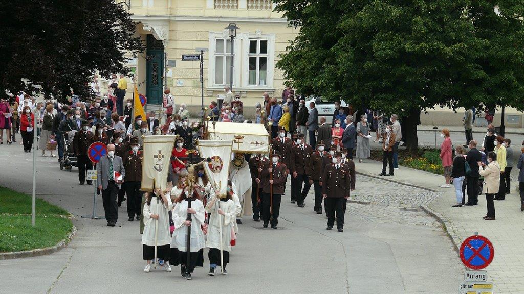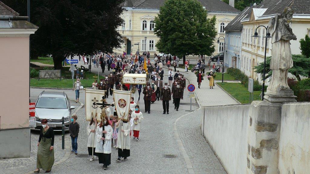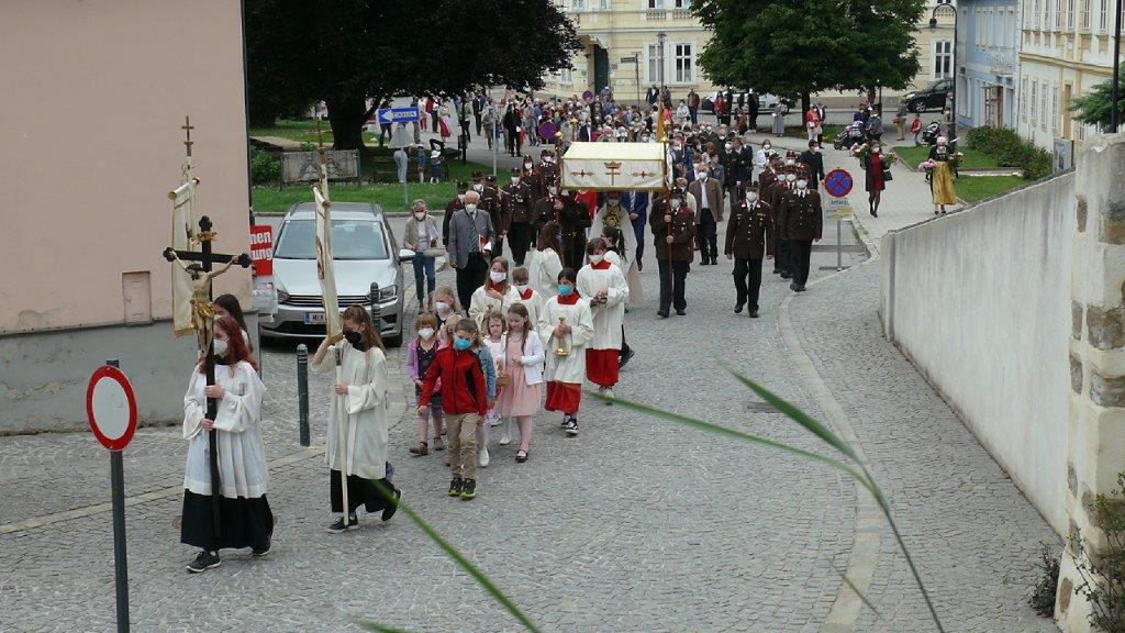Pandemiebedingt fand auch heuer (Sonntag, 6.6.2021) nur eine stark reduzierte Fronleichnams-Prozession statt. Von der Dreifaltigkeitssäule, wo Stadtpfarrer Leopold Mathias die Hl. Messe zelebrierte, ging es durch die Friedhofsgasse und die Kaiser Josef-Straße zur Kirche.