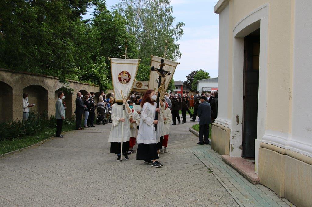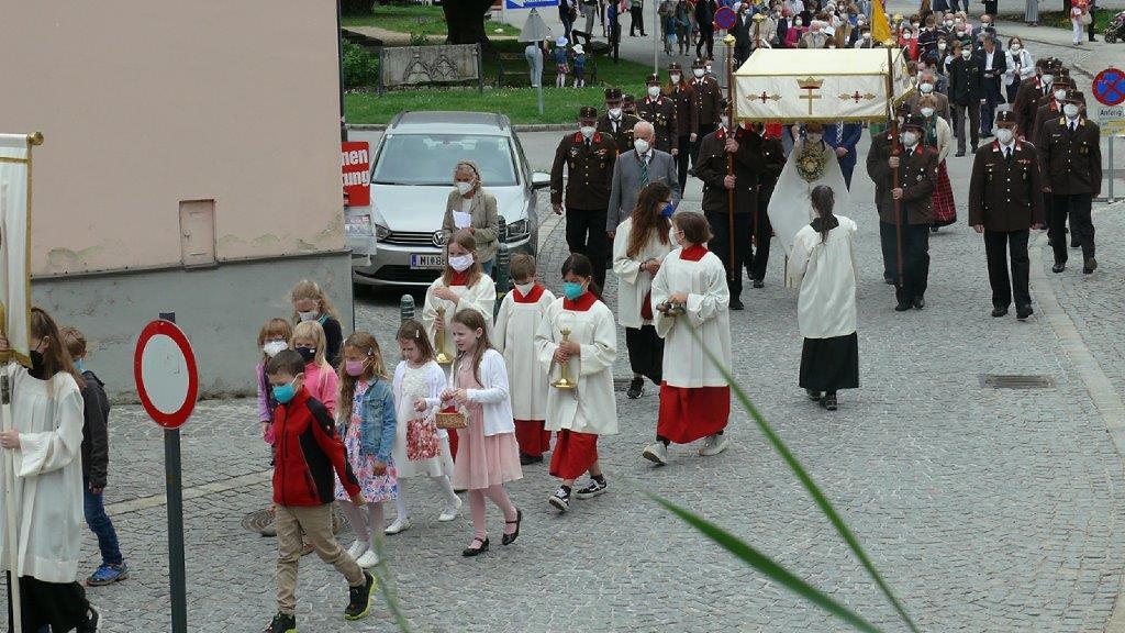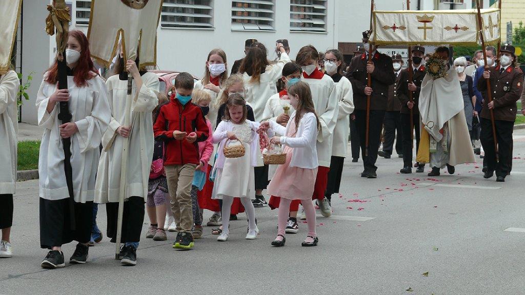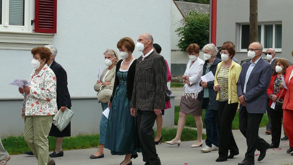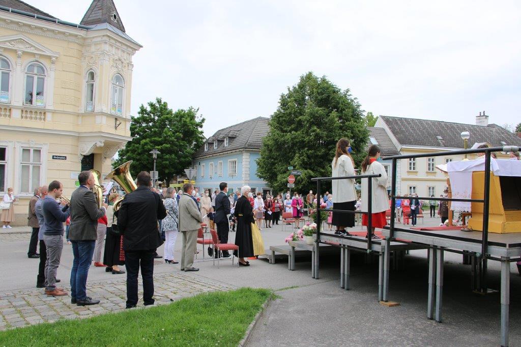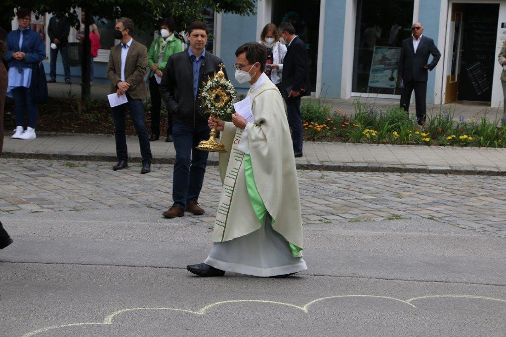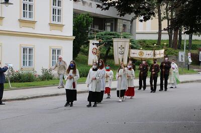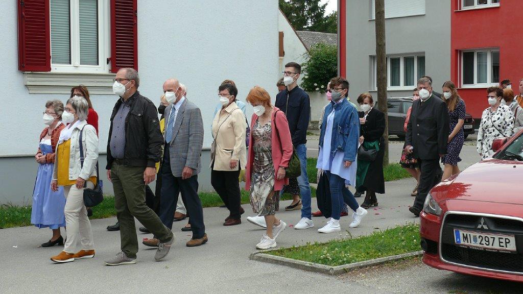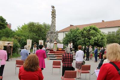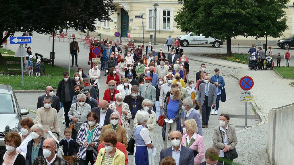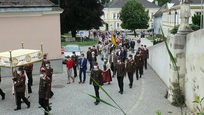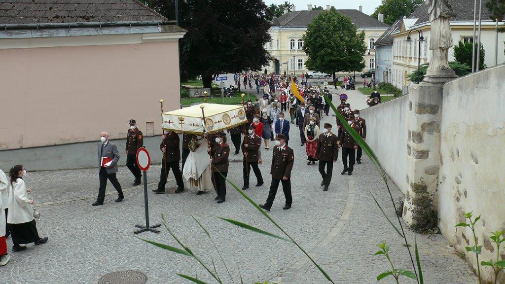 Pandemiebedingt fand auch heuer (Sonntag, 6.6.2021) nur eine stark reduzierte Fronleichnams-Prozession statt. Von der Dreifaltigkeitssäule, wo Stadtpfarrer Leopold Mathias die Hl. Messe zelebrierte, ging es durch die Friedhofsgasse und die Kaiser Josef-Straße zur Kirche.