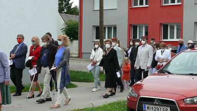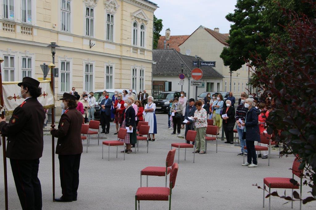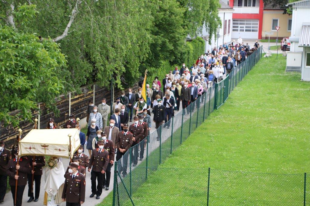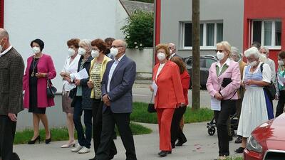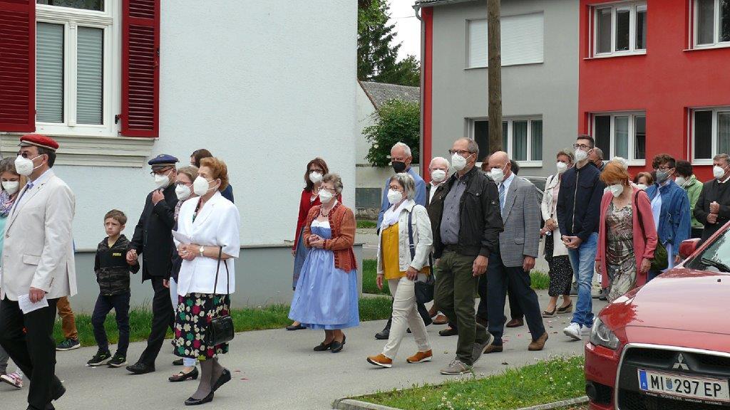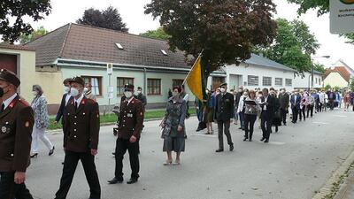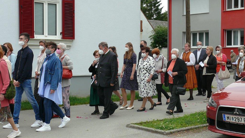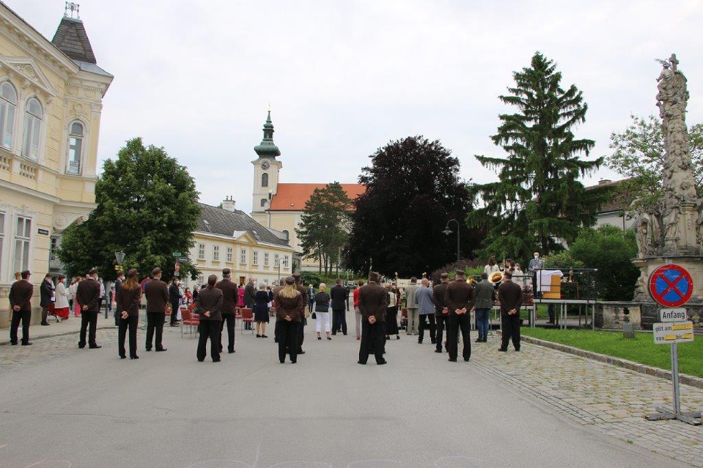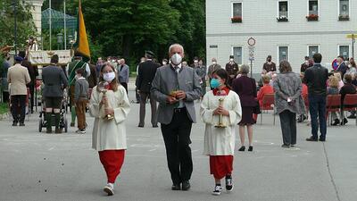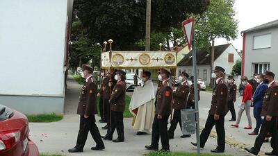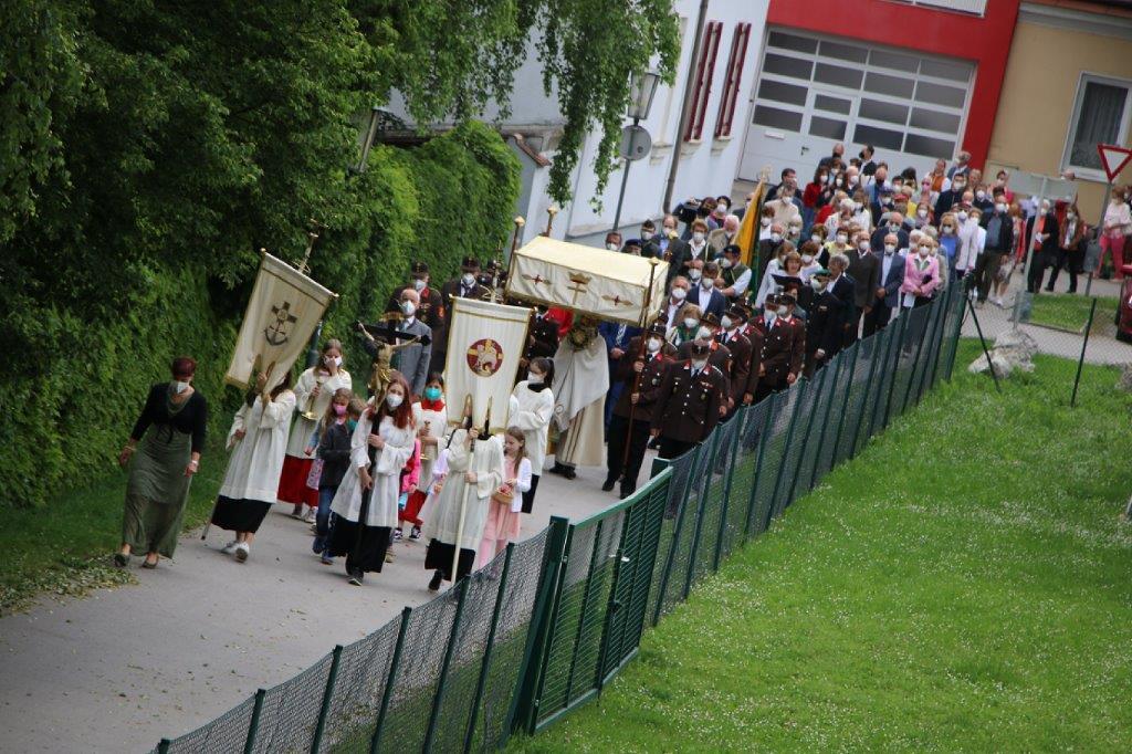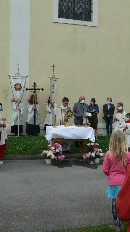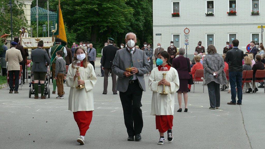 Pandemiebedingt fand auch heuer (Sonntag, 6.6.2021) nur eine stark reduzierte Fronleichnams-Prozession statt. Von der Dreifaltigkeitssäule, wo Stadtpfarrer Leopold Mathias die Hl. Messe zelebrierte, ging es durch die Friedhofsgasse und die Kaiser Josef-Straße zur Kirche.