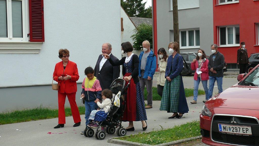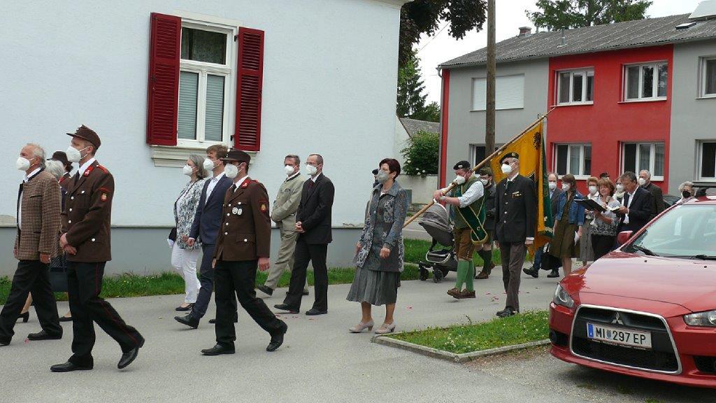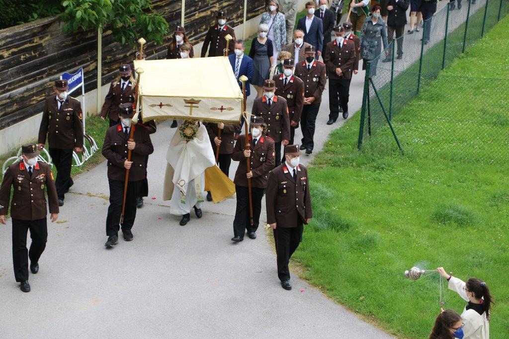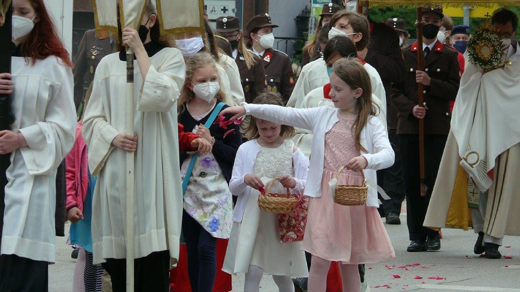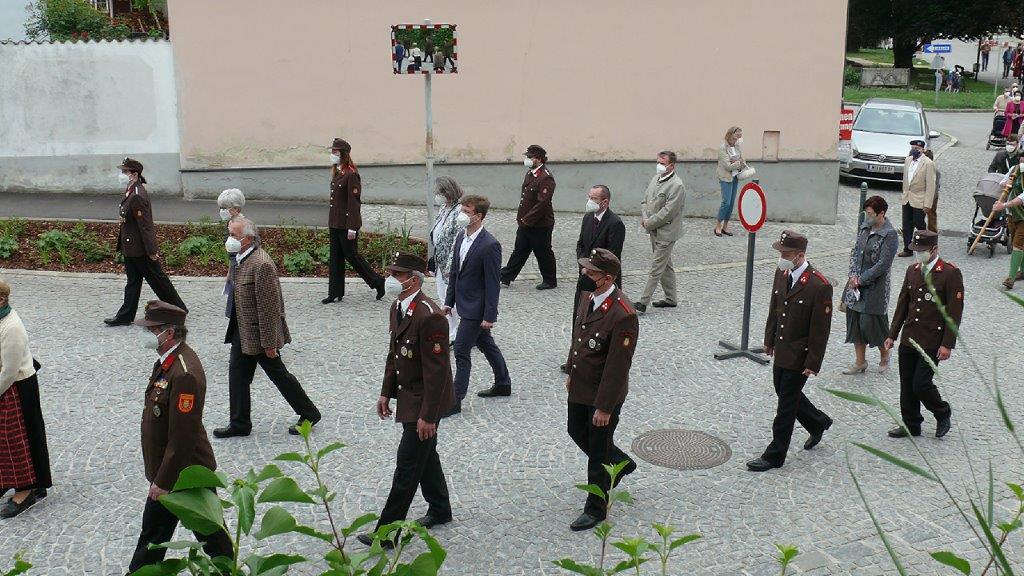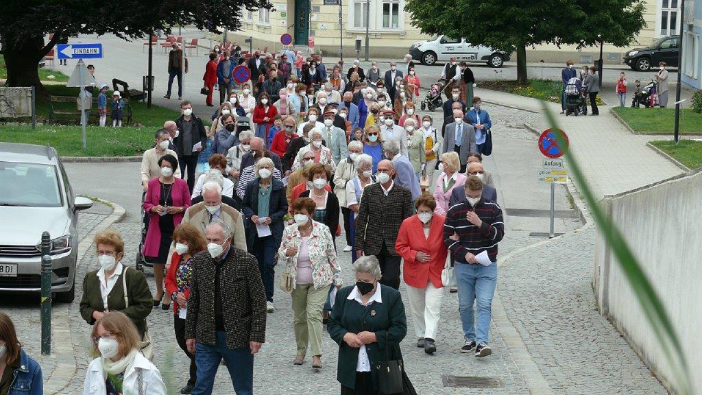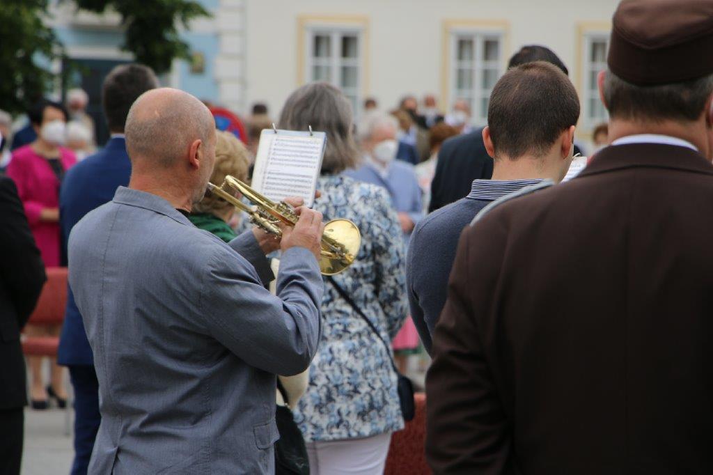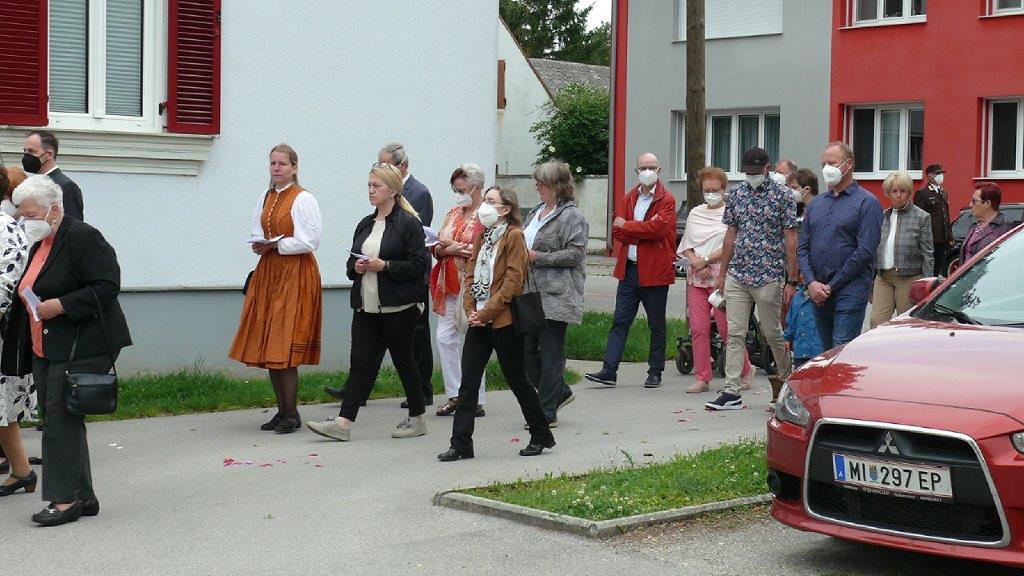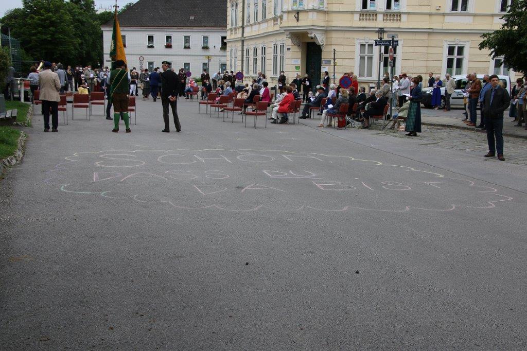 Pandemiebedingt fand auch heuer (Sonntag, 6.6.2021) nur eine stark reduzierte Fronleichnams-Prozession statt. Von der Dreifaltigkeitssäule, wo Stadtpfarrer Leopold Mathias die Hl. Messe zelebrierte, ging es durch die Friedhofsgasse und die Kaiser Josef-Straße zur Kirche.