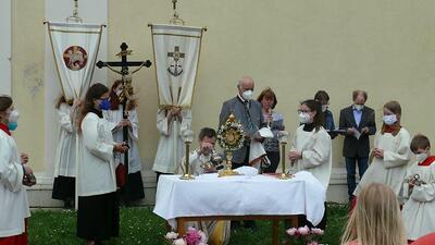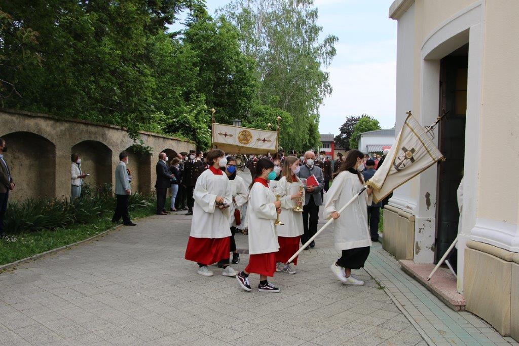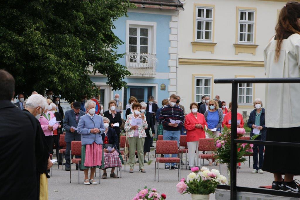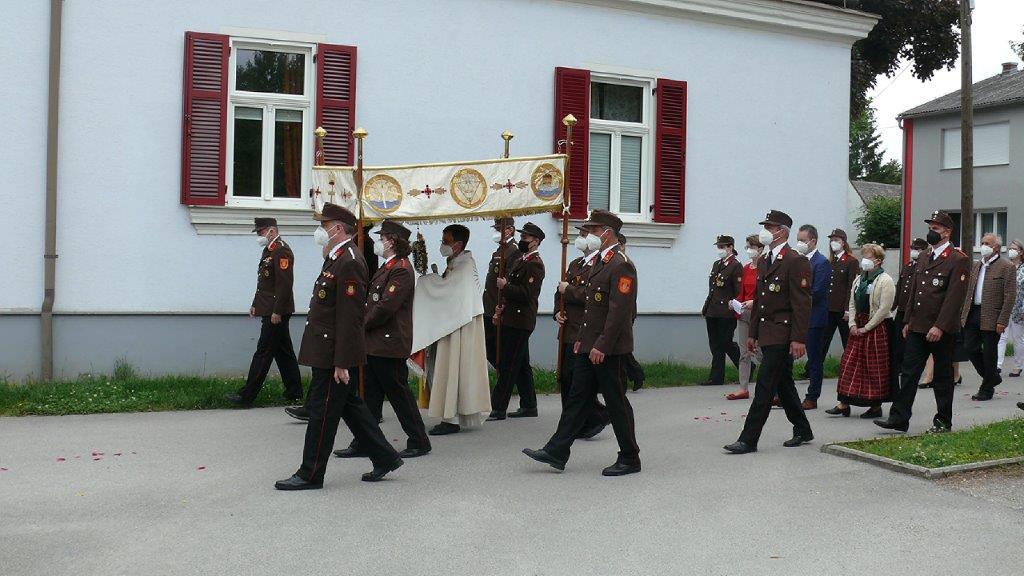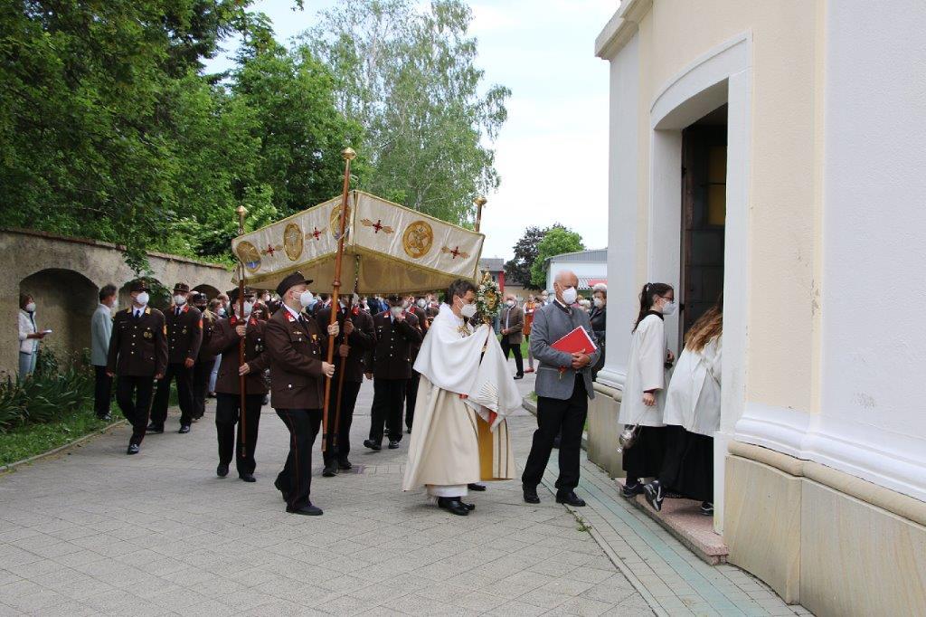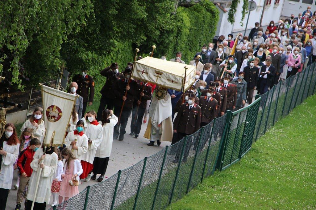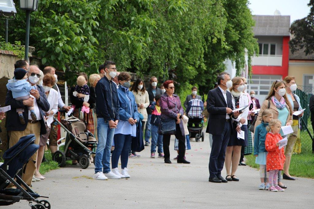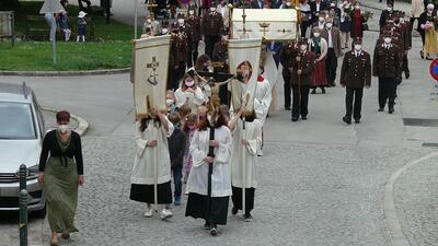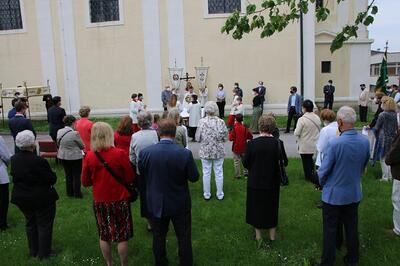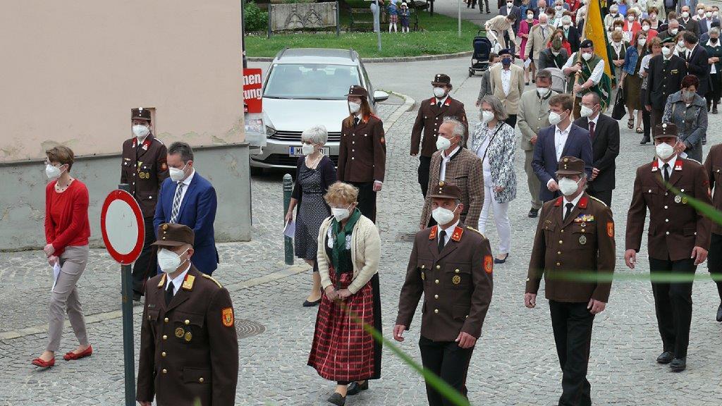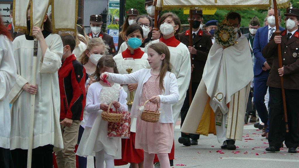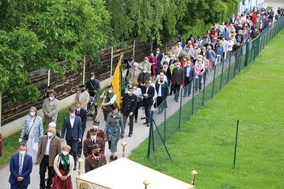 Pandemiebedingt fand auch heuer (Sonntag, 6.6.2021) nur eine stark reduzierte Fronleichnams-Prozession statt. Von der Dreifaltigkeitssäule, wo Stadtpfarrer Leopold Mathias die Hl. Messe zelebrierte, ging es durch die Friedhofsgasse und die Kaiser Josef-Straße zur Kirche.