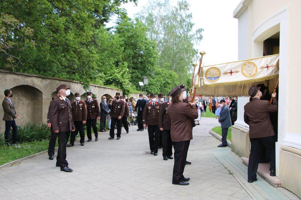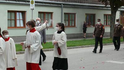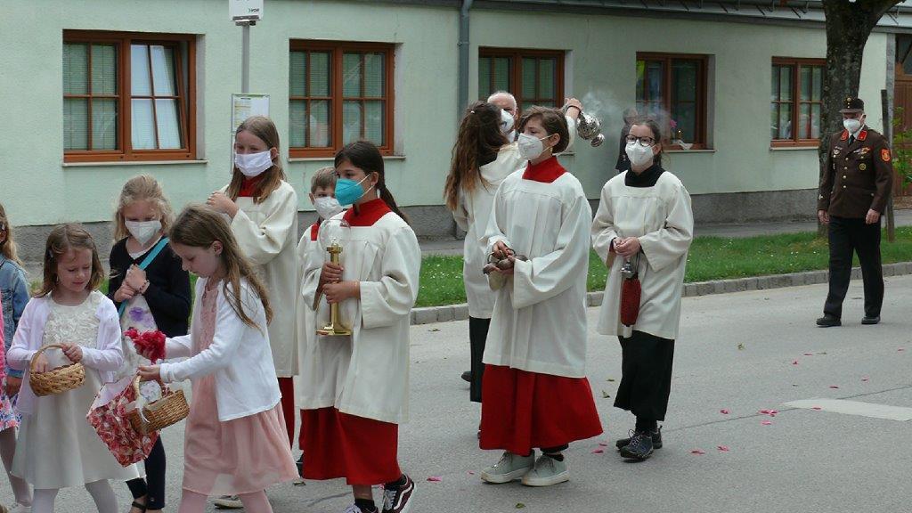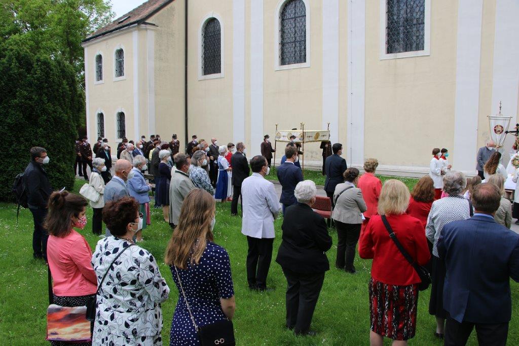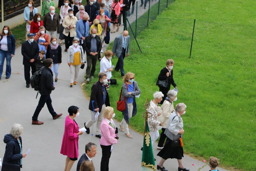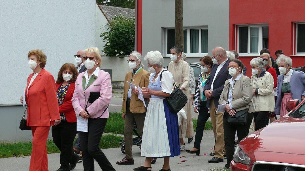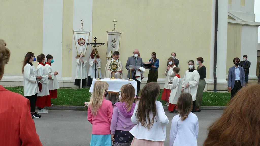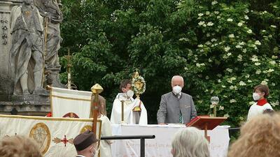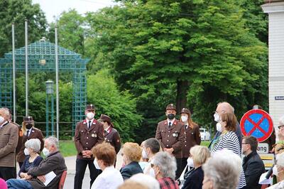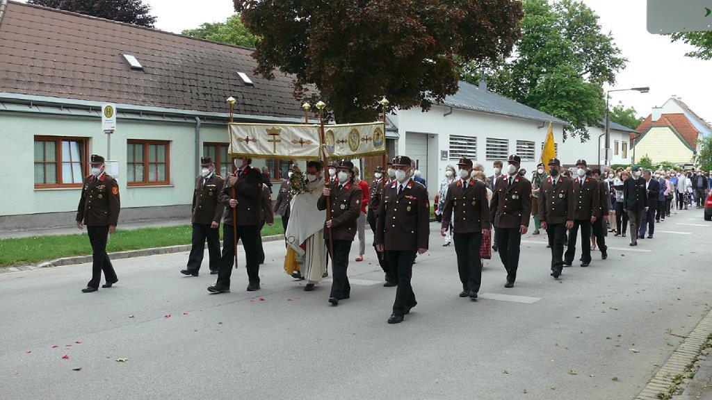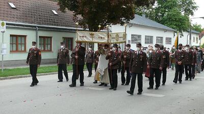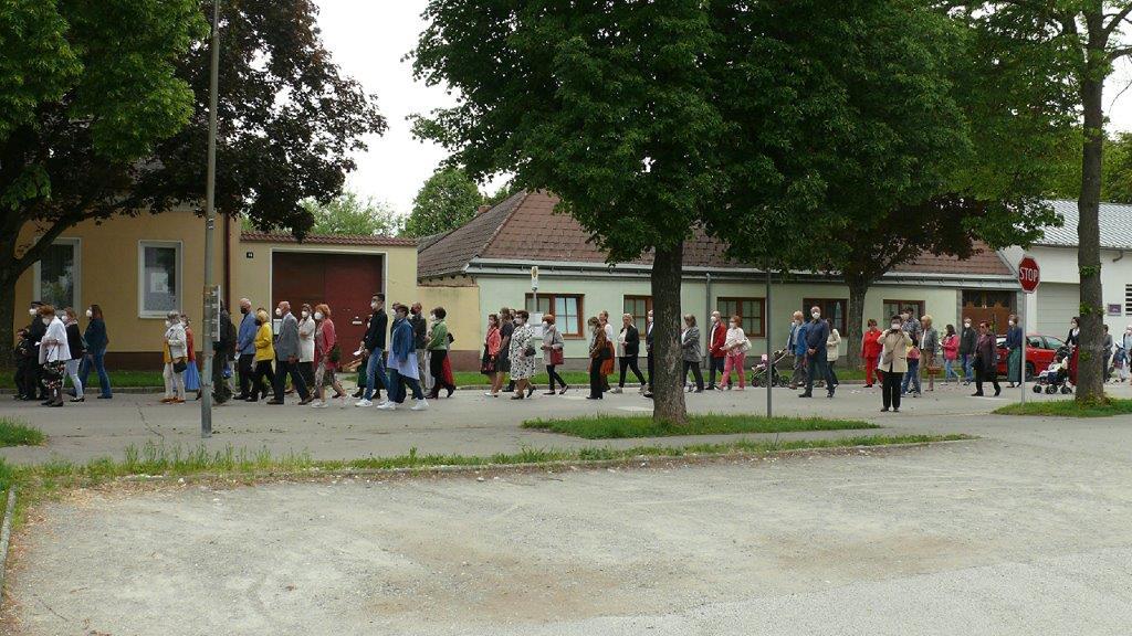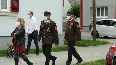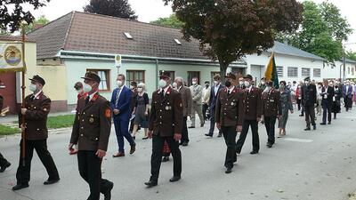 Pandemiebedingt fand auch heuer (Sonntag, 6.6.2021) nur eine stark reduzierte Fronleichnams-Prozession statt. Von der Dreifaltigkeitssäule, wo Stadtpfarrer Leopold Mathias die Hl. Messe zelebrierte, ging es durch die Friedhofsgasse und die Kaiser Josef-Straße zur Kirche.