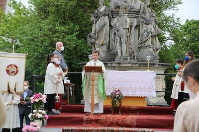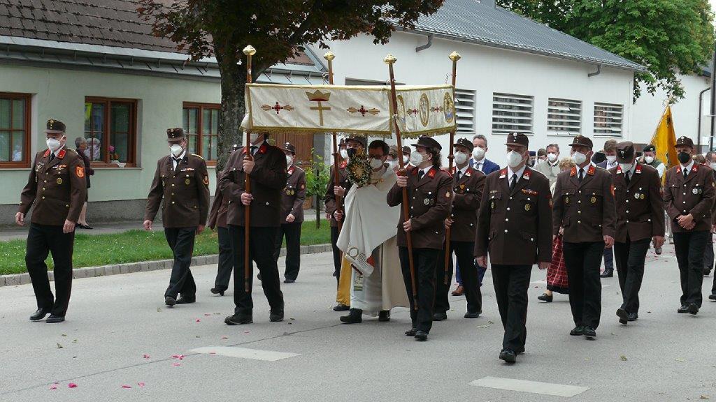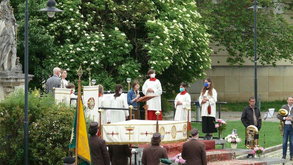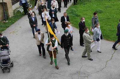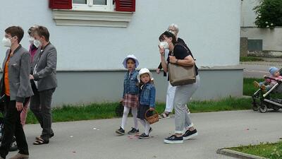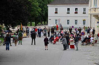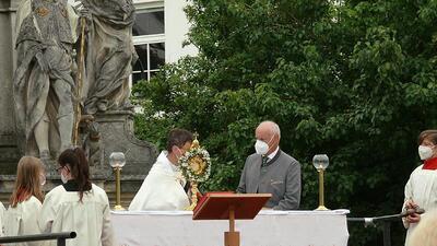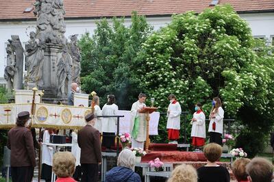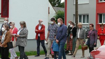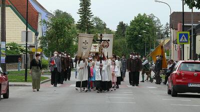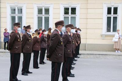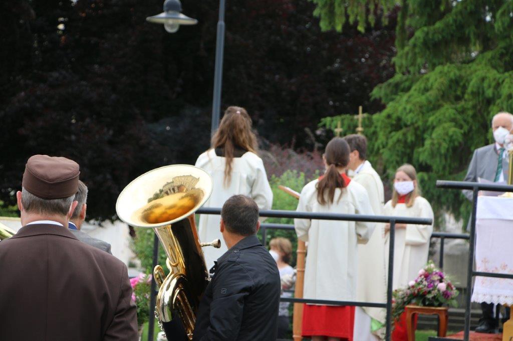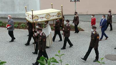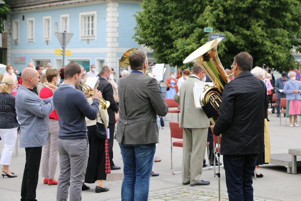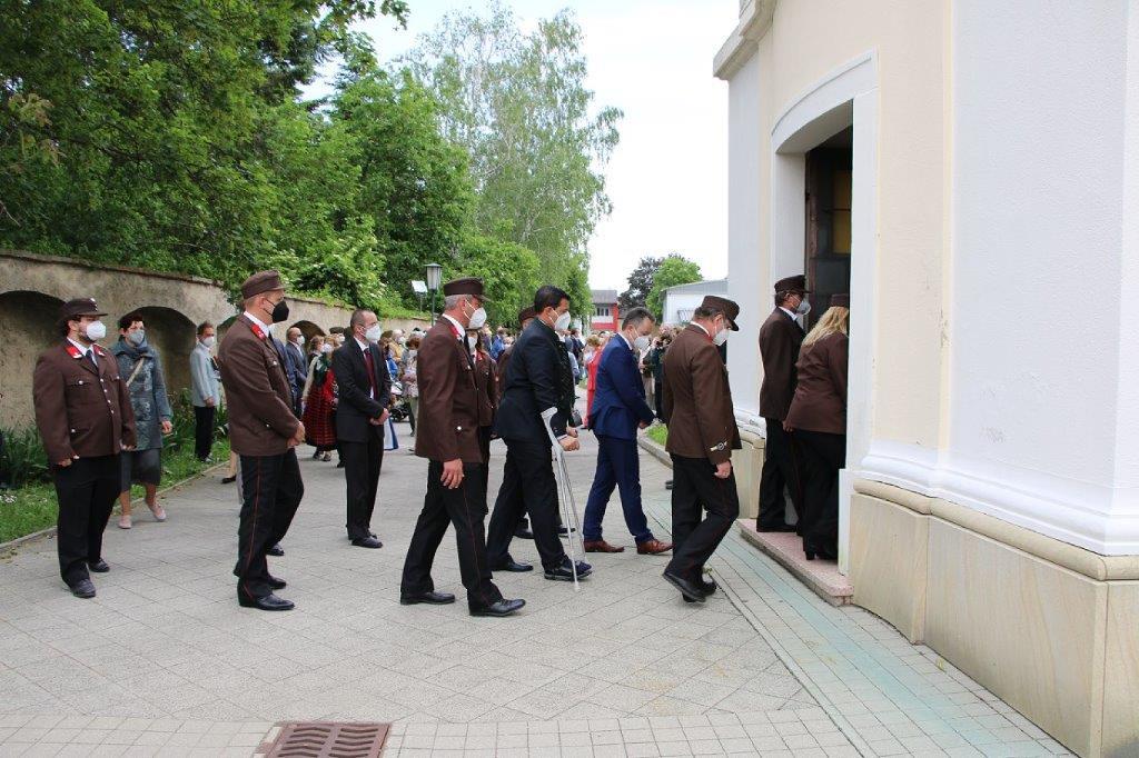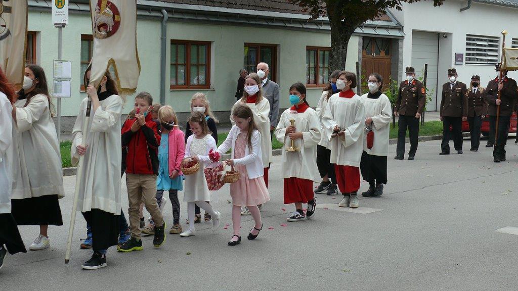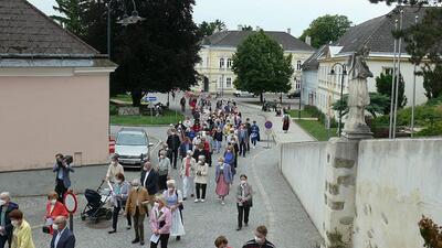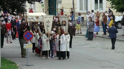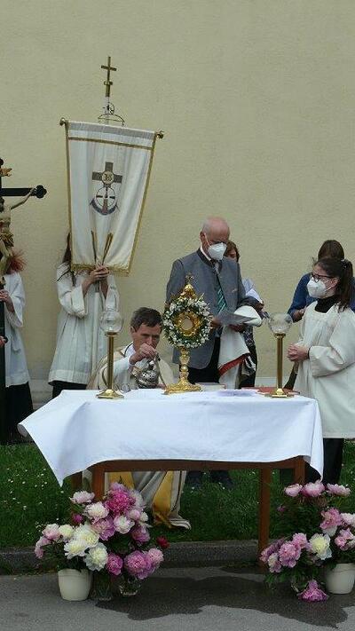 Pandemiebedingt fand auch heuer (Sonntag, 6.6.2021) nur eine stark reduzierte Fronleichnams-Prozession statt. Von der Dreifaltigkeitssäule, wo Stadtpfarrer Leopold Mathias die Hl. Messe zelebrierte, ging es durch die Friedhofsgasse und die Kaiser Josef-Straße zur Kirche.