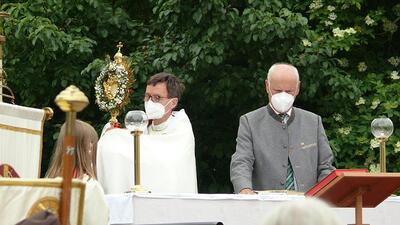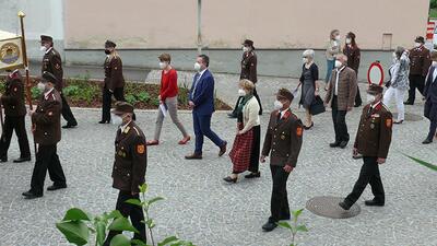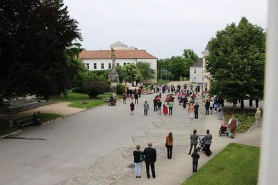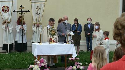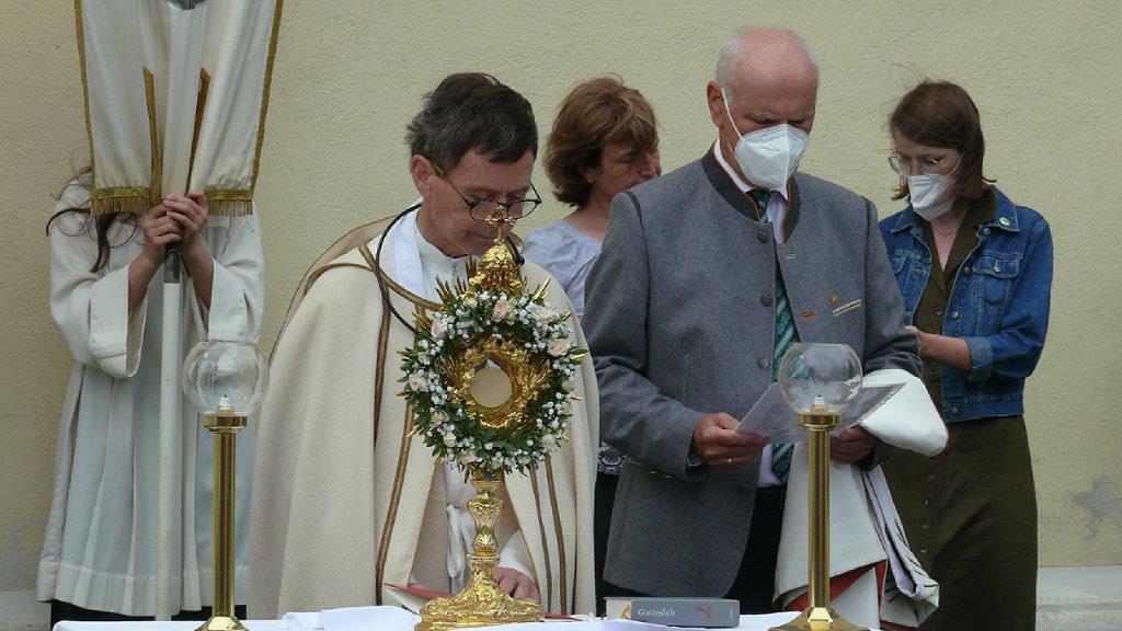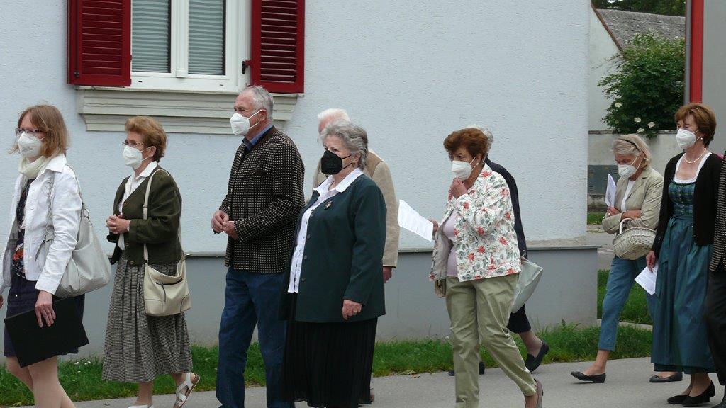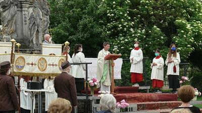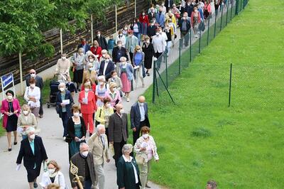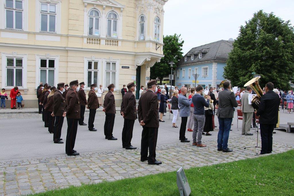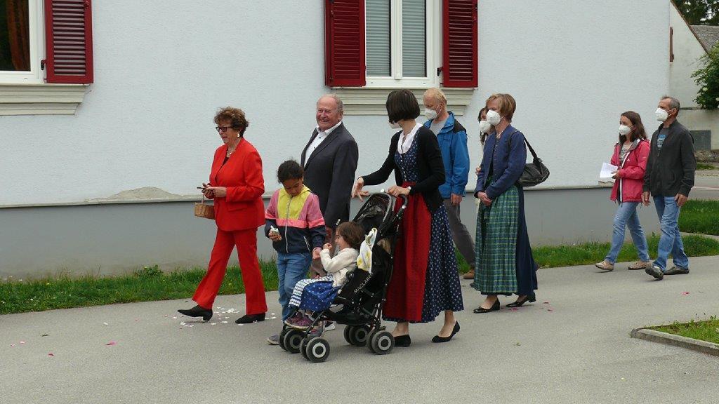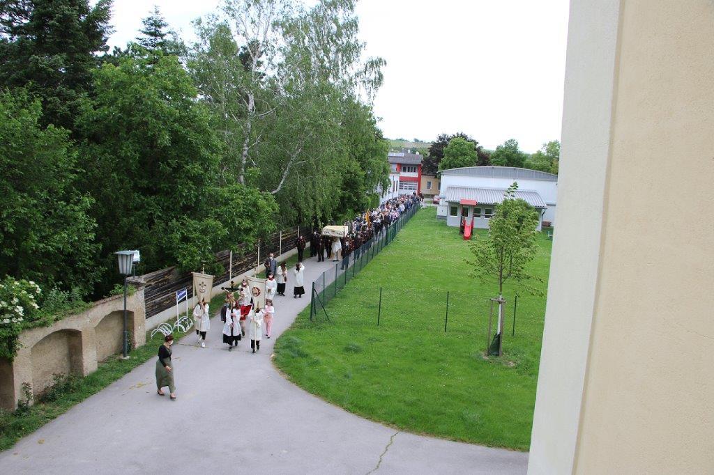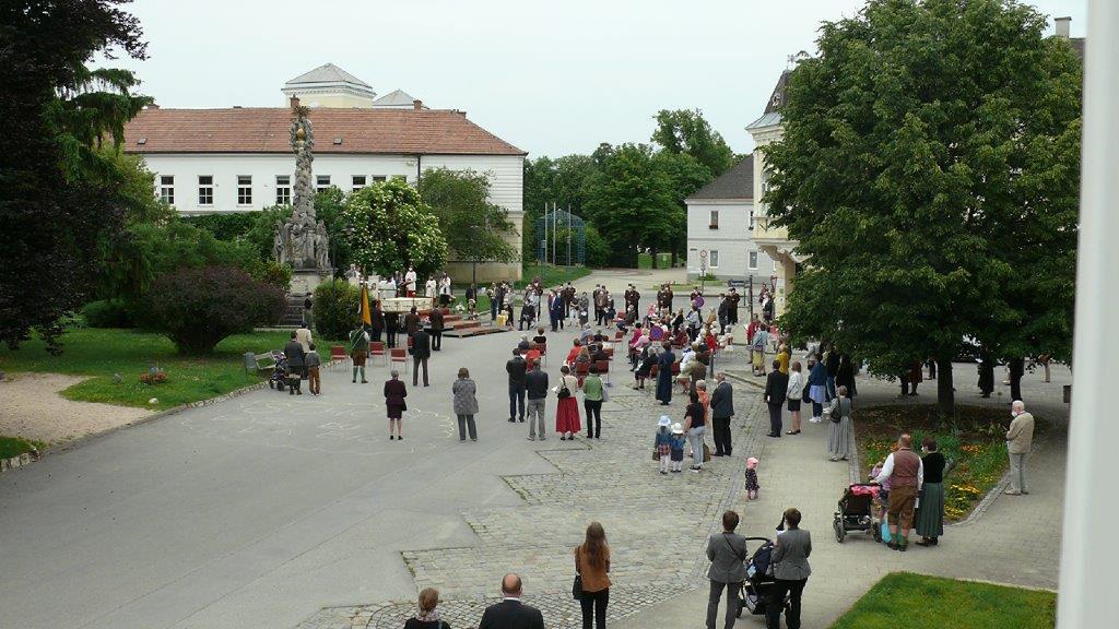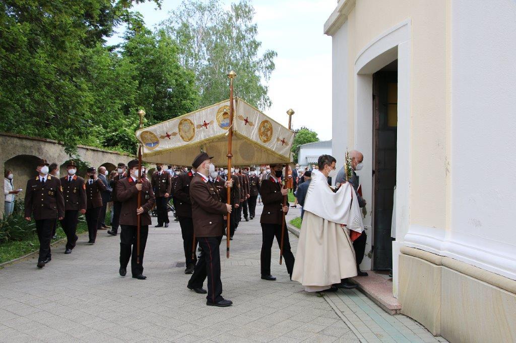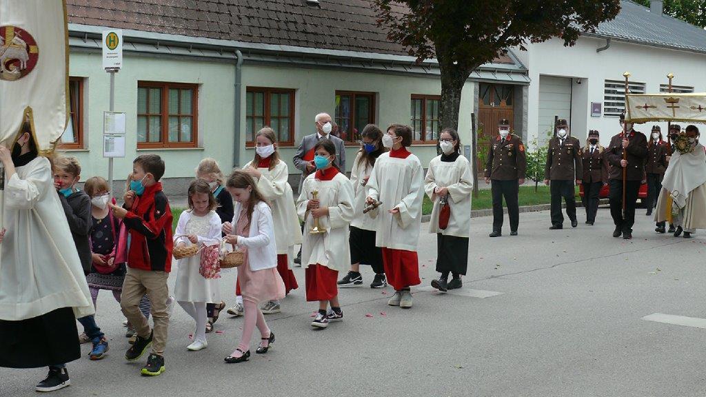 Pandemiebedingt fand auch heuer (Sonntag, 6.6.2021) nur eine stark reduzierte Fronleichnams-Prozession statt. Von der Dreifaltigkeitssäule, wo Stadtpfarrer Leopold Mathias die Hl. Messe zelebrierte, ging es durch die Friedhofsgasse und die Kaiser Josef-Straße zur Kirche.