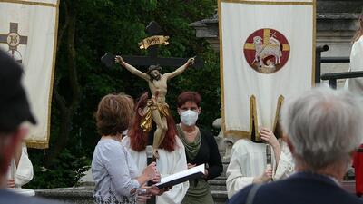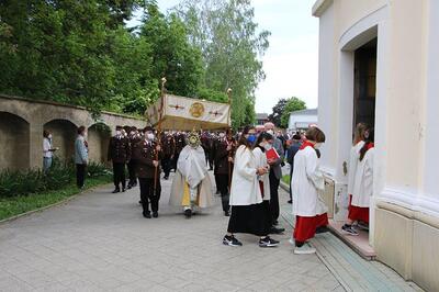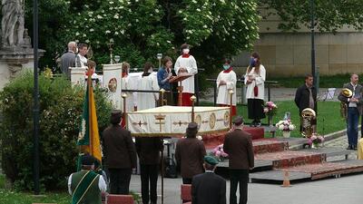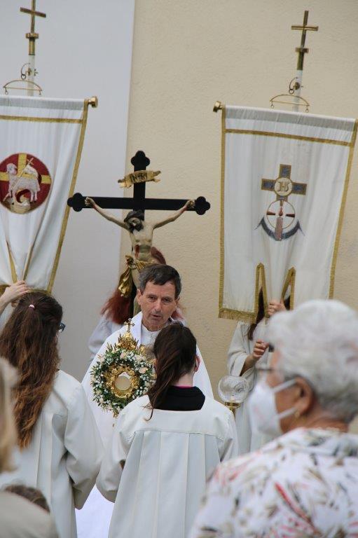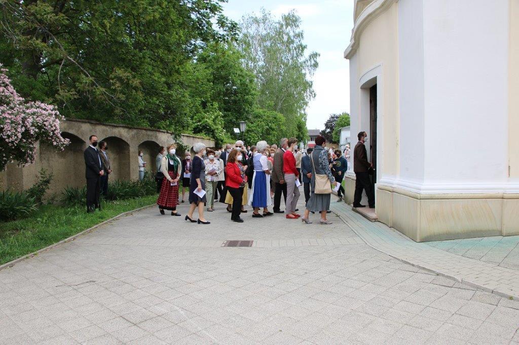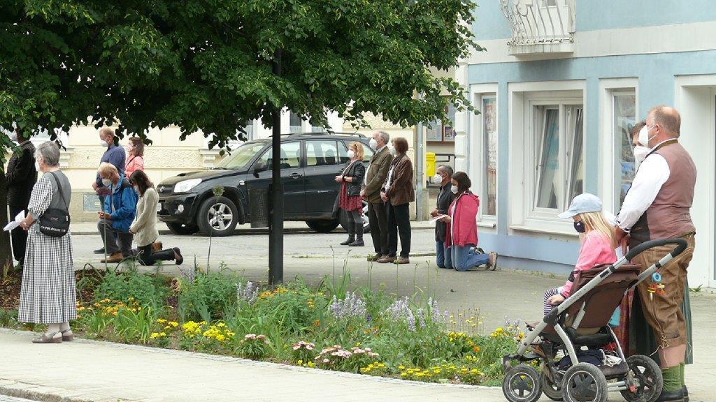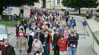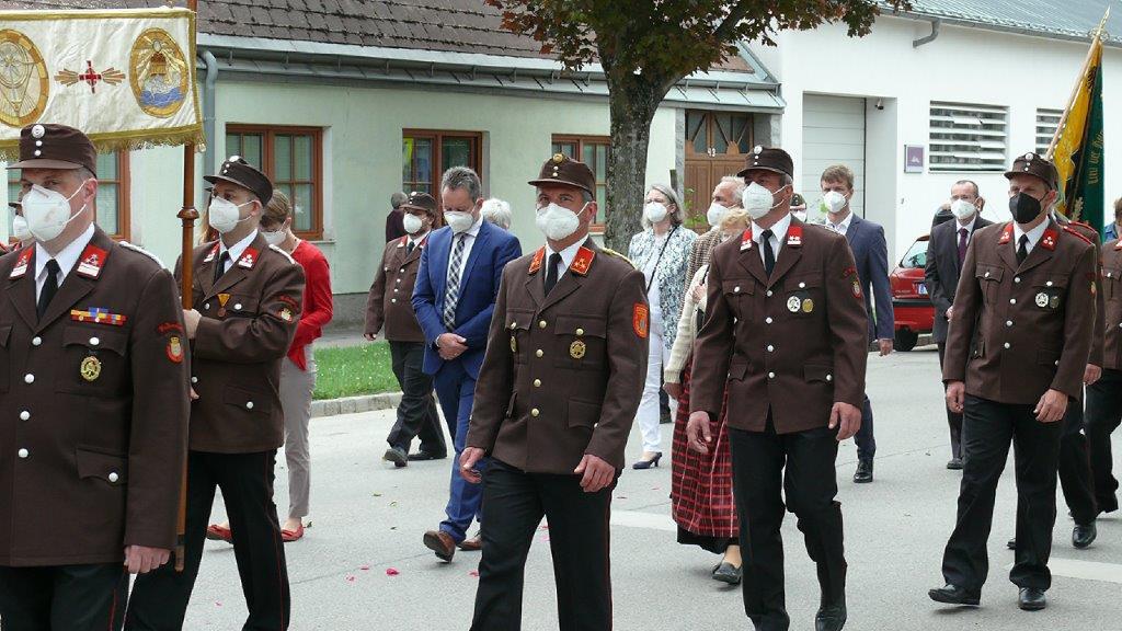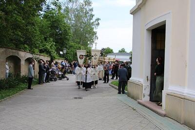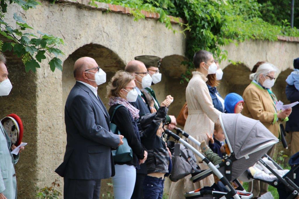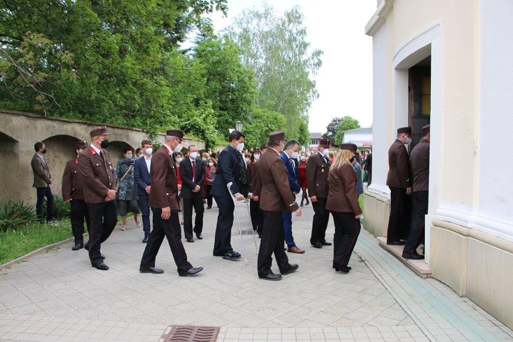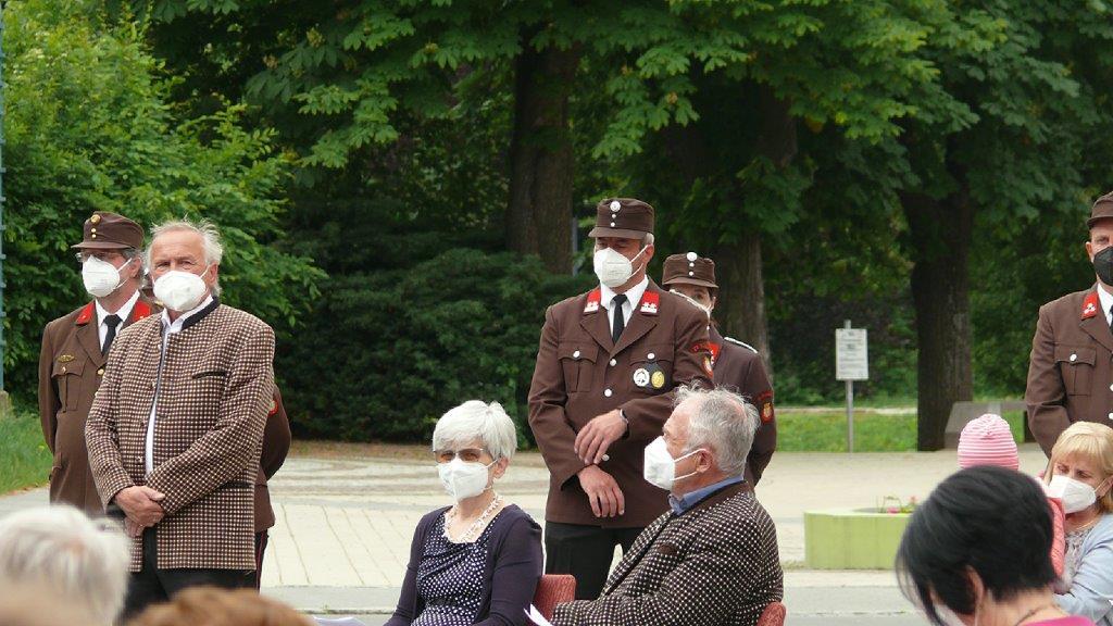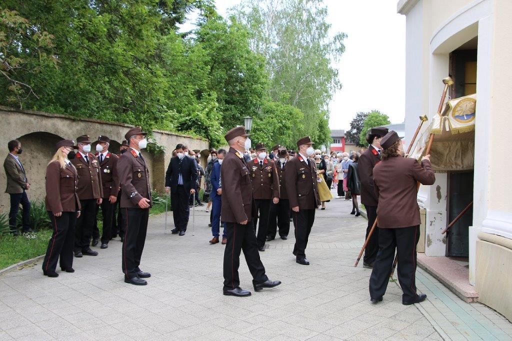 Pandemiebedingt fand auch heuer (Sonntag, 6.6.2021) nur eine stark reduzierte Fronleichnams-Prozession statt. Von der Dreifaltigkeitssäule, wo Stadtpfarrer Leopold Mathias die Hl. Messe zelebrierte, ging es durch die Friedhofsgasse und die Kaiser Josef-Straße zur Kirche.