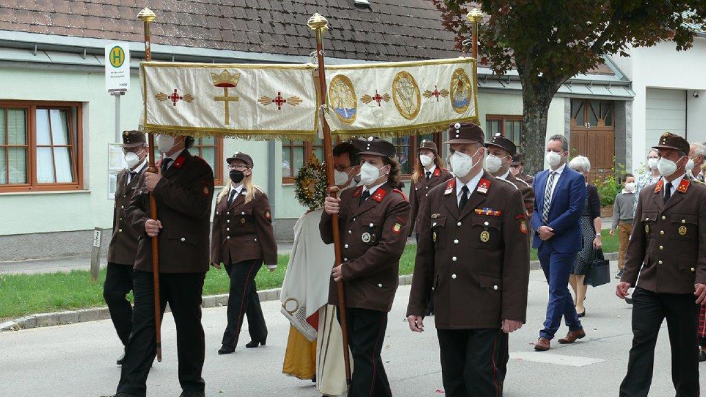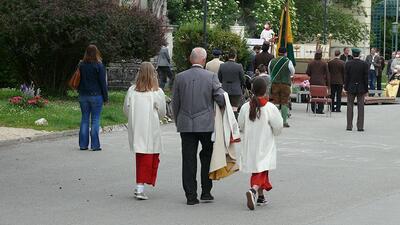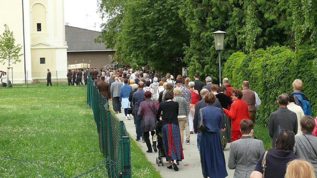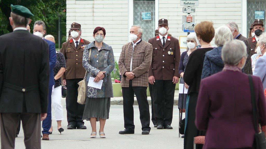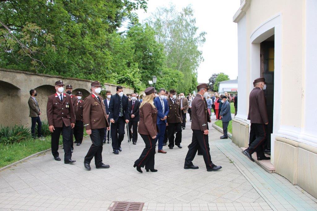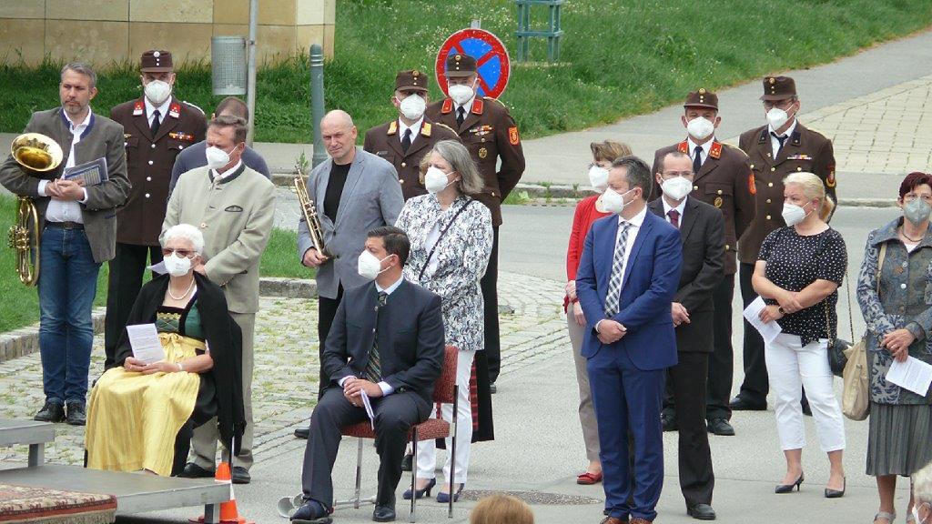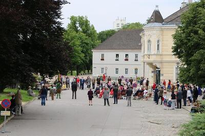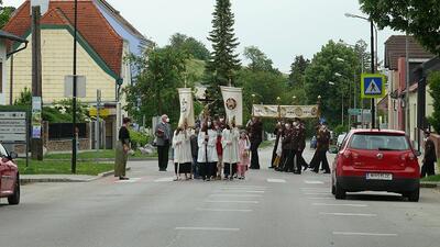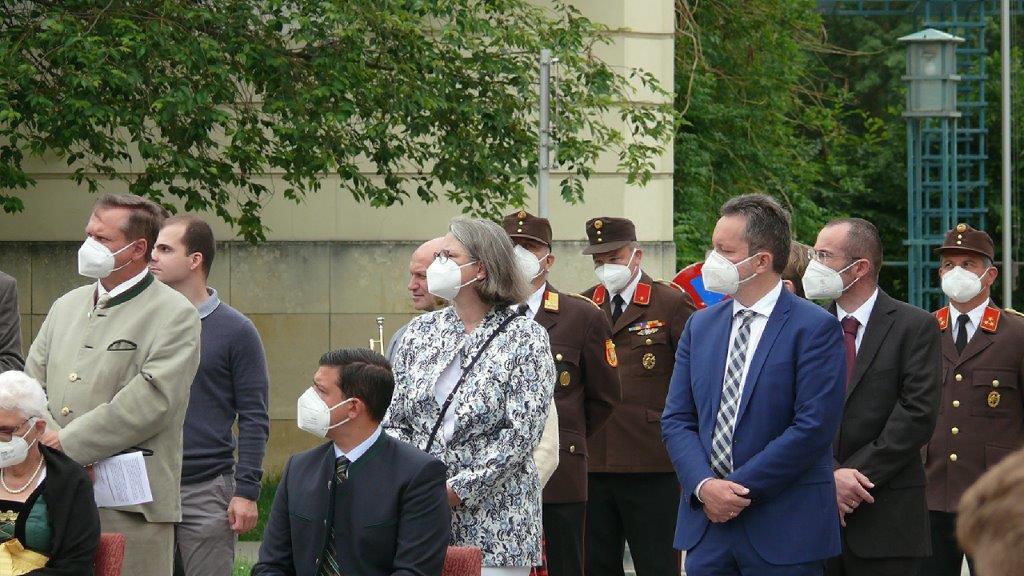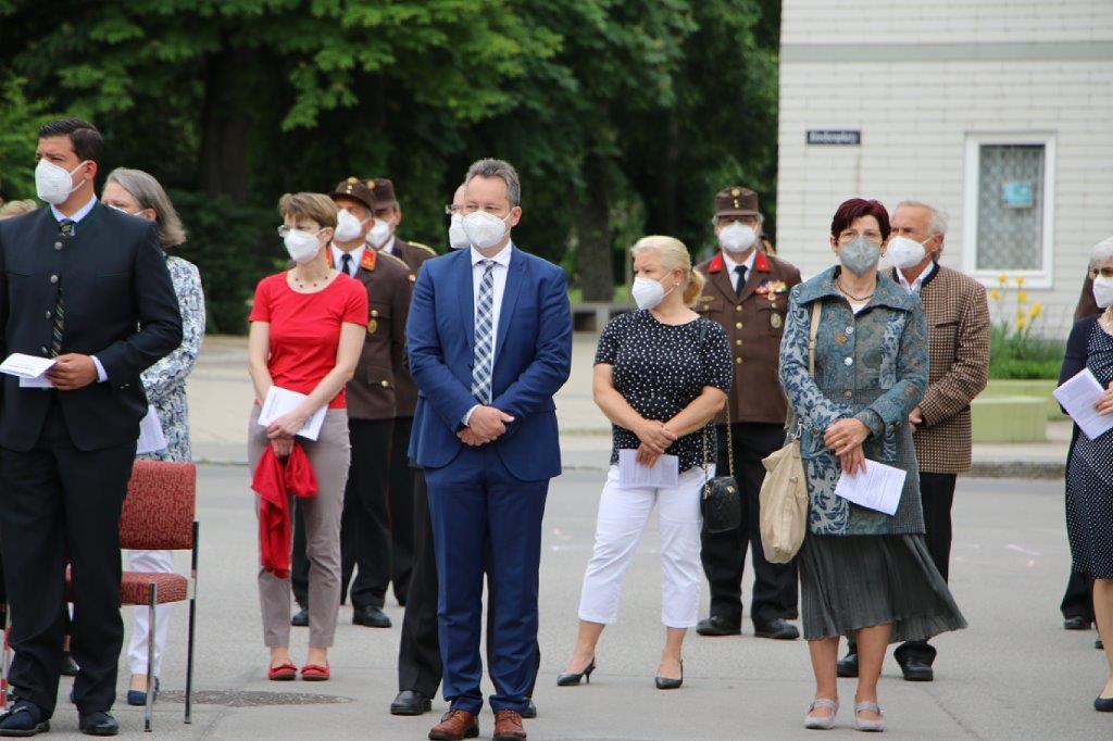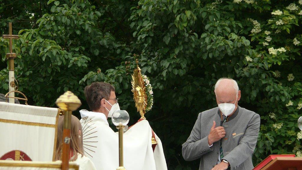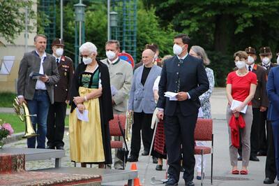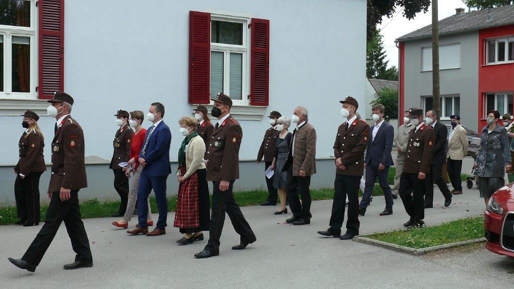 Pandemiebedingt fand auch heuer (Sonntag, 6.6.2021) nur eine stark reduzierte Fronleichnams-Prozession statt. Von der Dreifaltigkeitssäule, wo Stadtpfarrer Leopold Mathias die Hl. Messe zelebrierte, ging es durch die Friedhofsgasse und die Kaiser Josef-Straße zur Kirche.