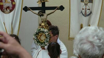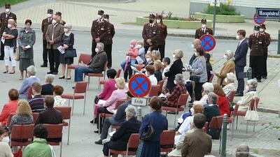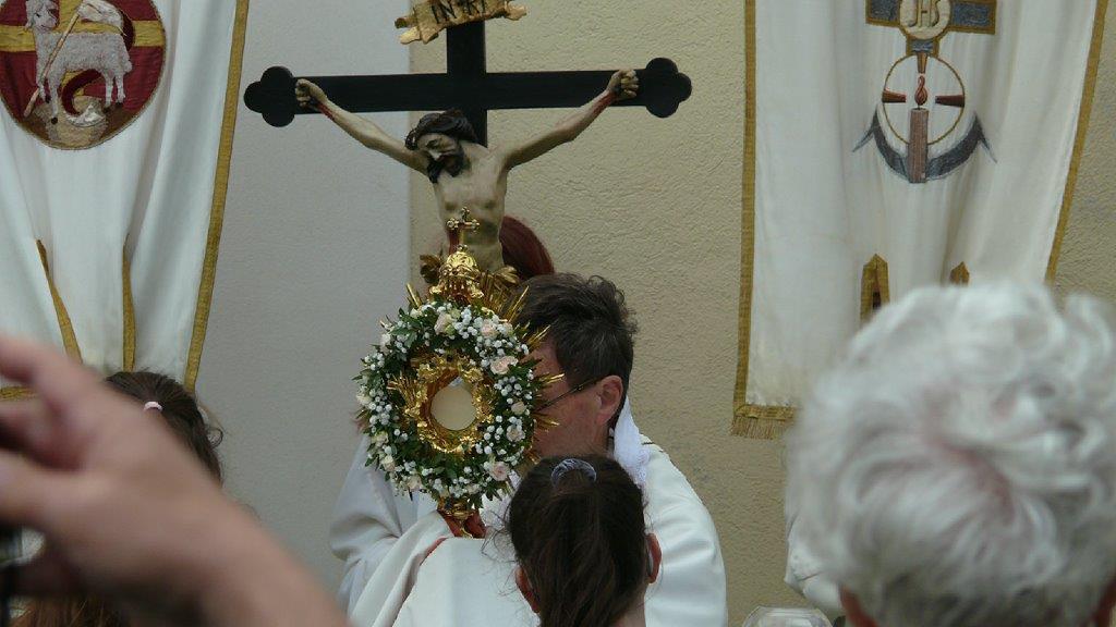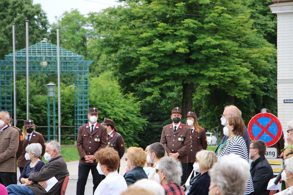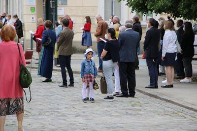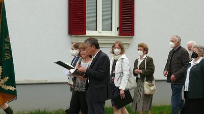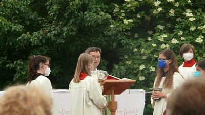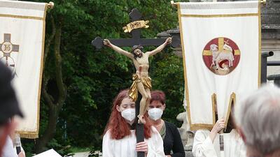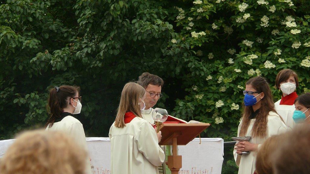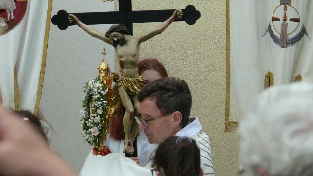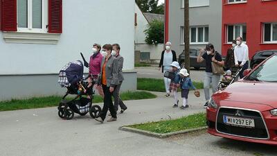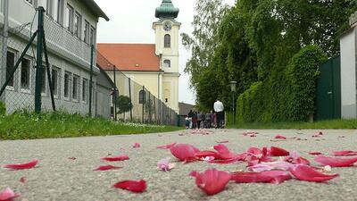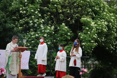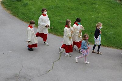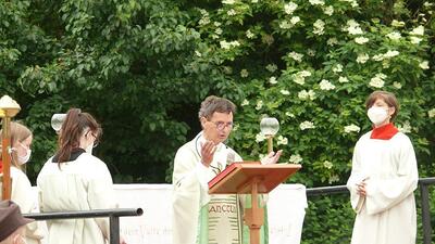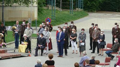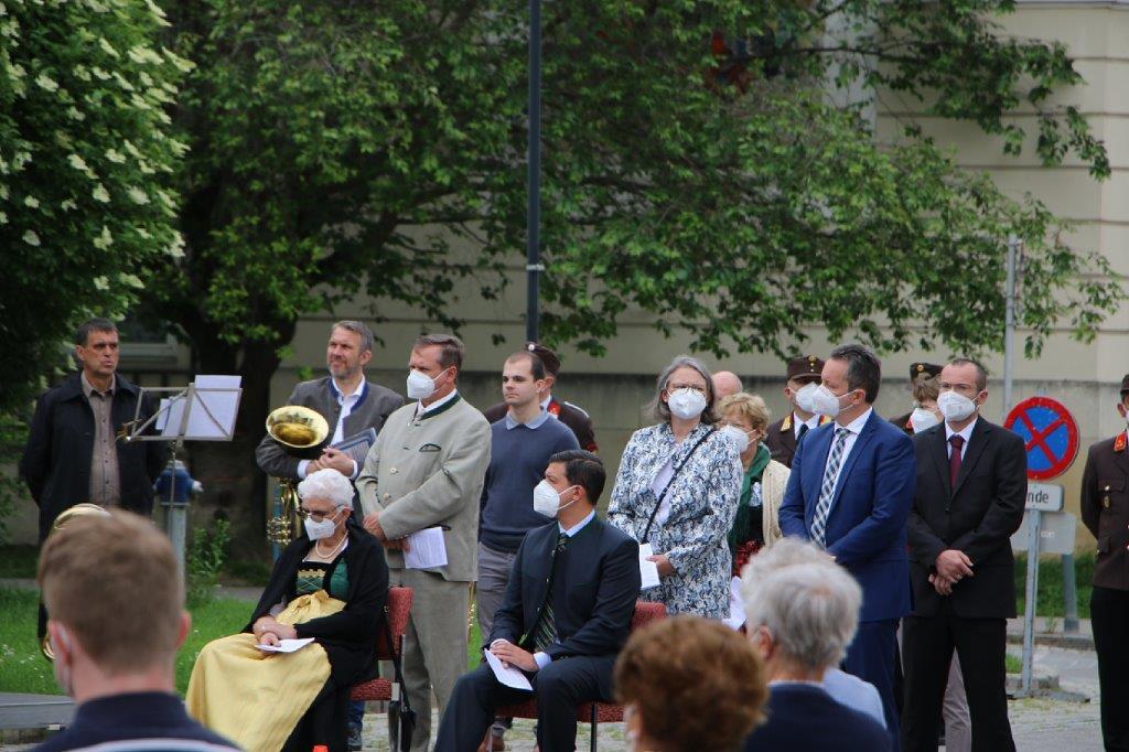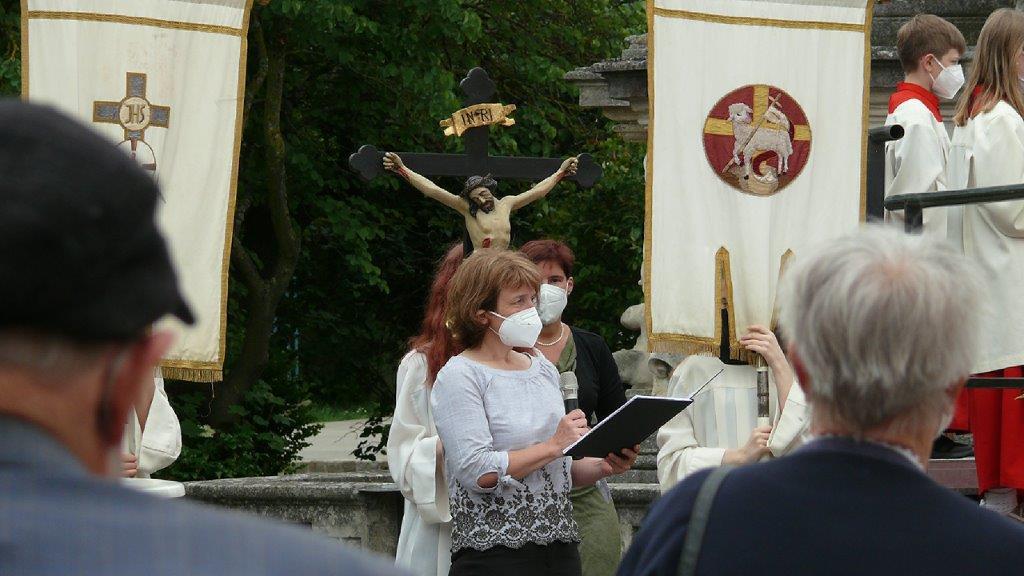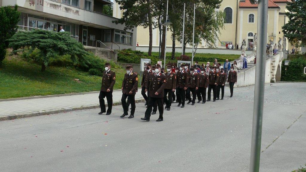 Pandemiebedingt fand auch heuer (Sonntag, 6.6.2021) nur eine stark reduzierte Fronleichnams-Prozession statt. Von der Dreifaltigkeitssäule, wo Stadtpfarrer Leopold Mathias die Hl. Messe zelebrierte, ging es durch die Friedhofsgasse und die Kaiser Josef-Straße zur Kirche.