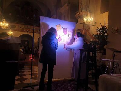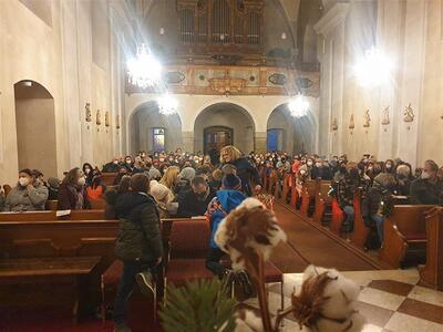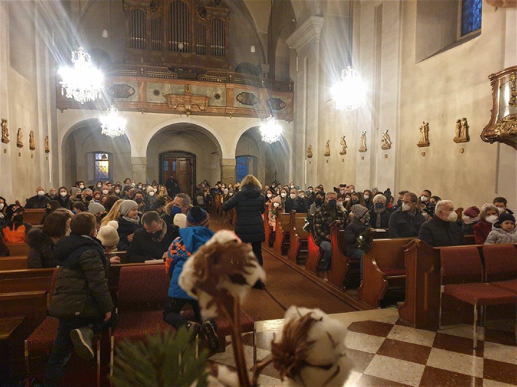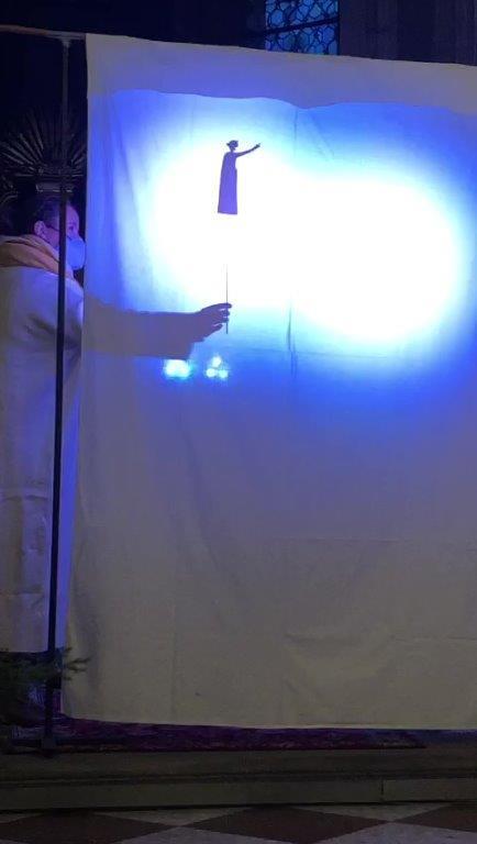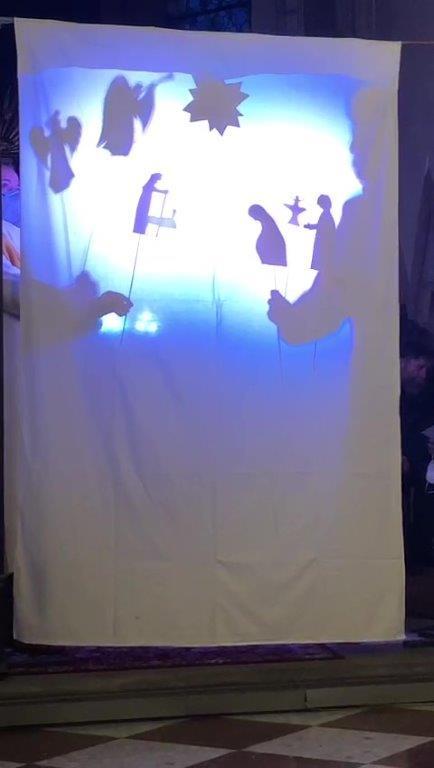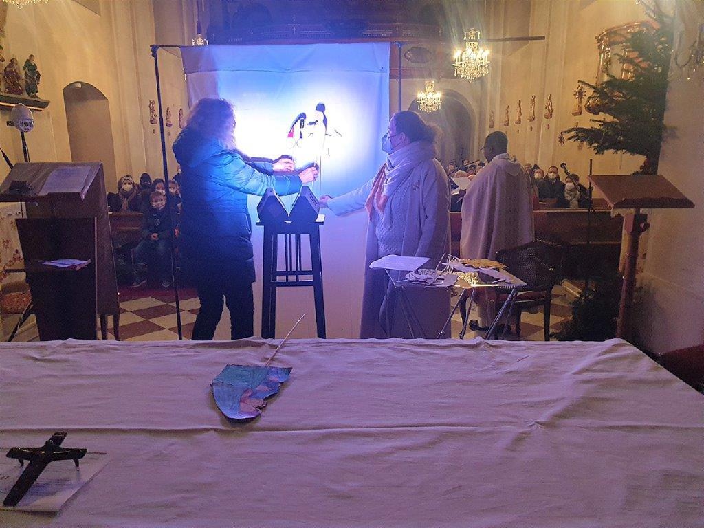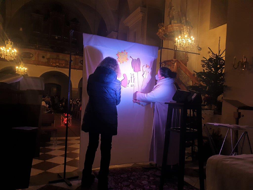 Am Heiligen Abend um 16 Uhr kamen viele Kinder in die Kirche, die sich coronakonform mit ihren Angehörigen in jeweils eine Bankreihe setzten. Bei diesem Gottesdienst wurde das Weihnachtsevangelium als Schattenspiel verkündet.