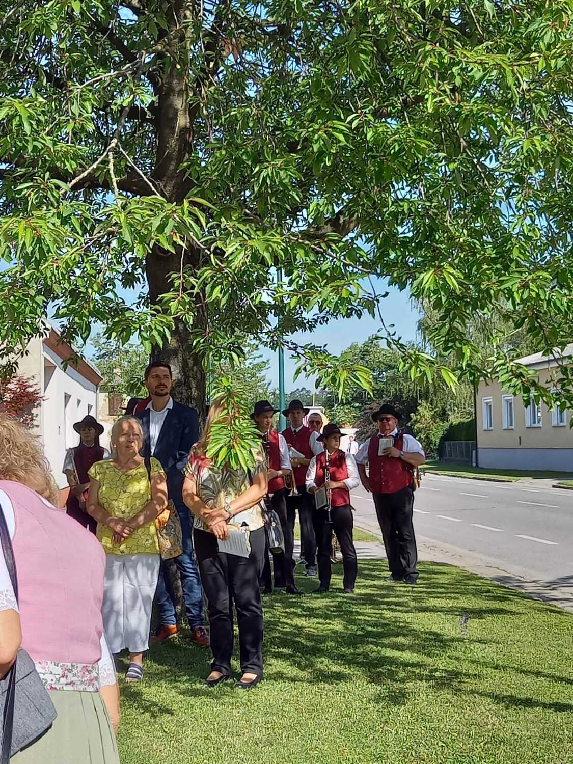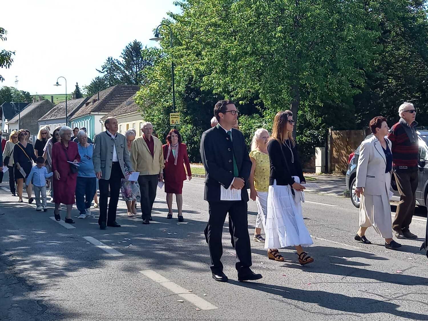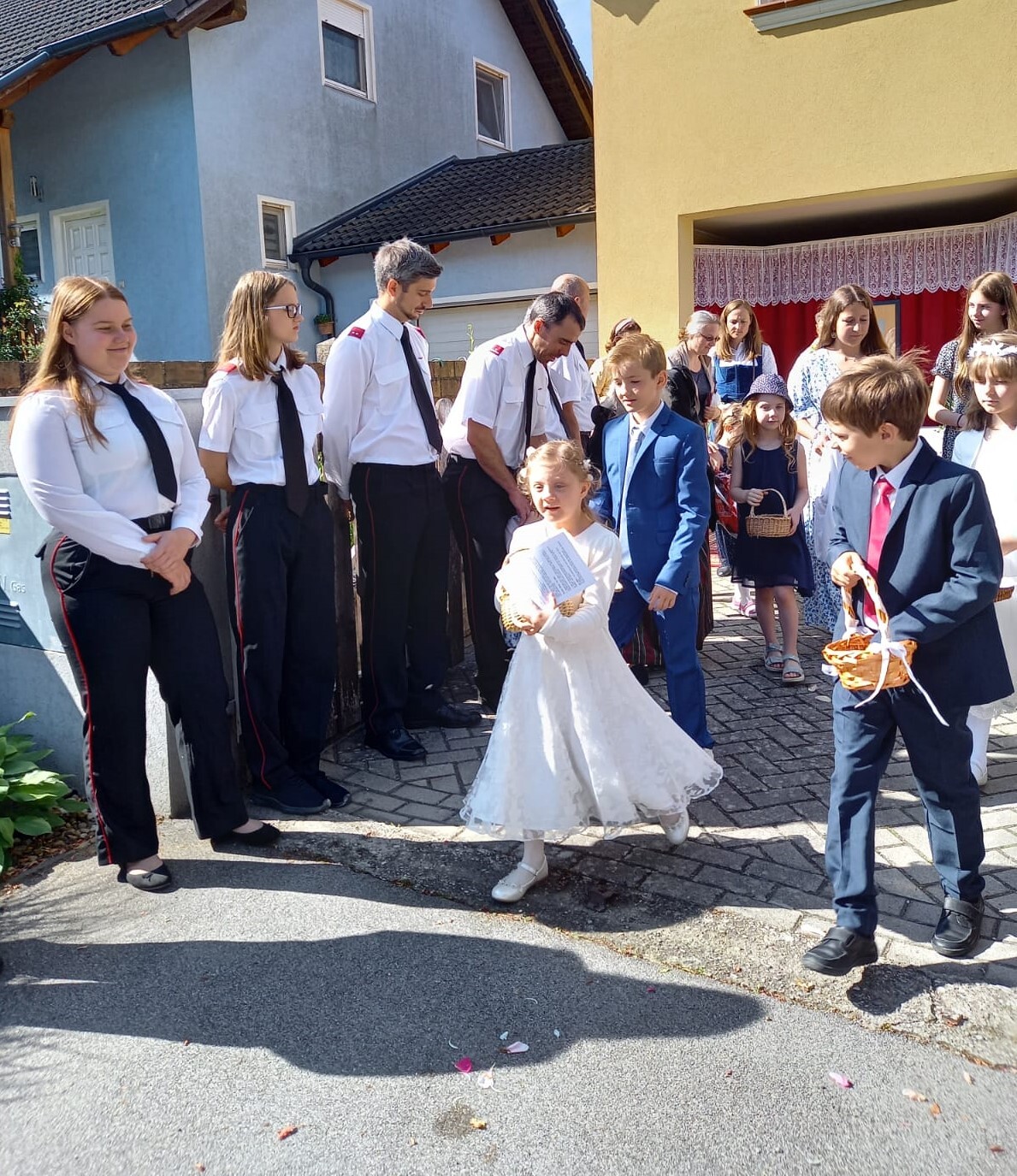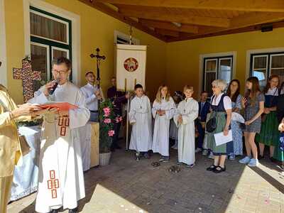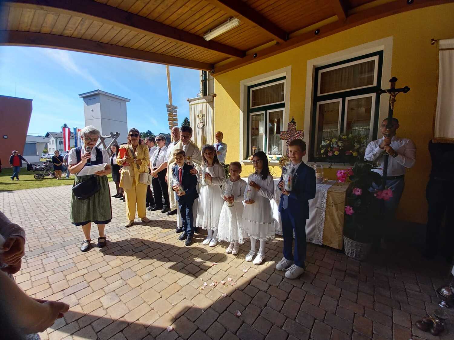 Nach Feier der Hl. Messe in der Kirche, zogen wir in Prozession durch den Ort zu den vier Altären. Beim letzten Altar wurden die 5 Erstkommunionkinder und 2 Firmlinge aus Riedenthal vorgestellt. Mit einer Agape beim Dorfhaus fand die schöne Feier einen gemütlichen Ausklang. Großen Dank: Pfarrer Leopold, den Vereinen für die Gestaltung der Altäre, der FF Riedenthal, sowie der Stadtkapelle für die feierliche musikalische Umrahmung der Prozession.