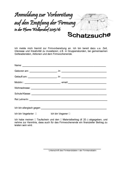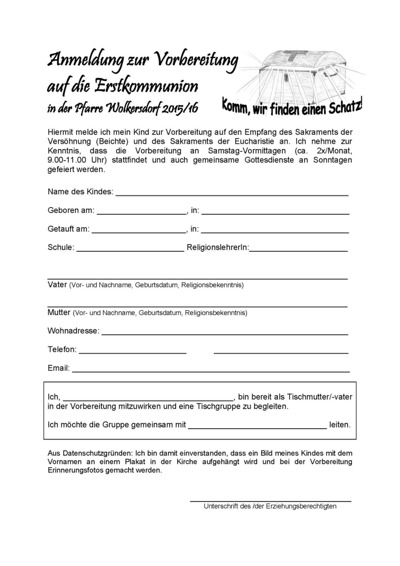 Bitte bringen Sie den Taufschein des Kindes, den Materialbeitrag von € 30.- und das ausgefüllte Anmeldeformular mit.