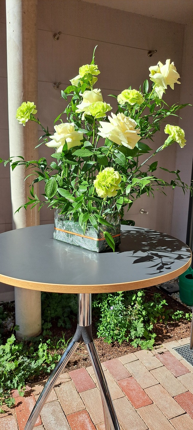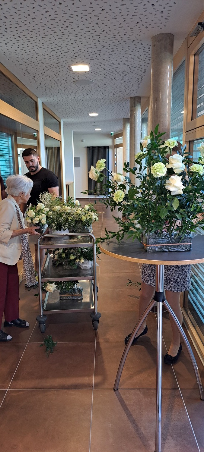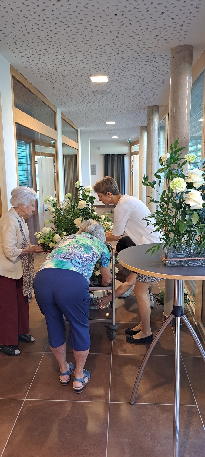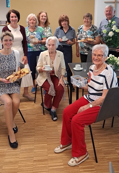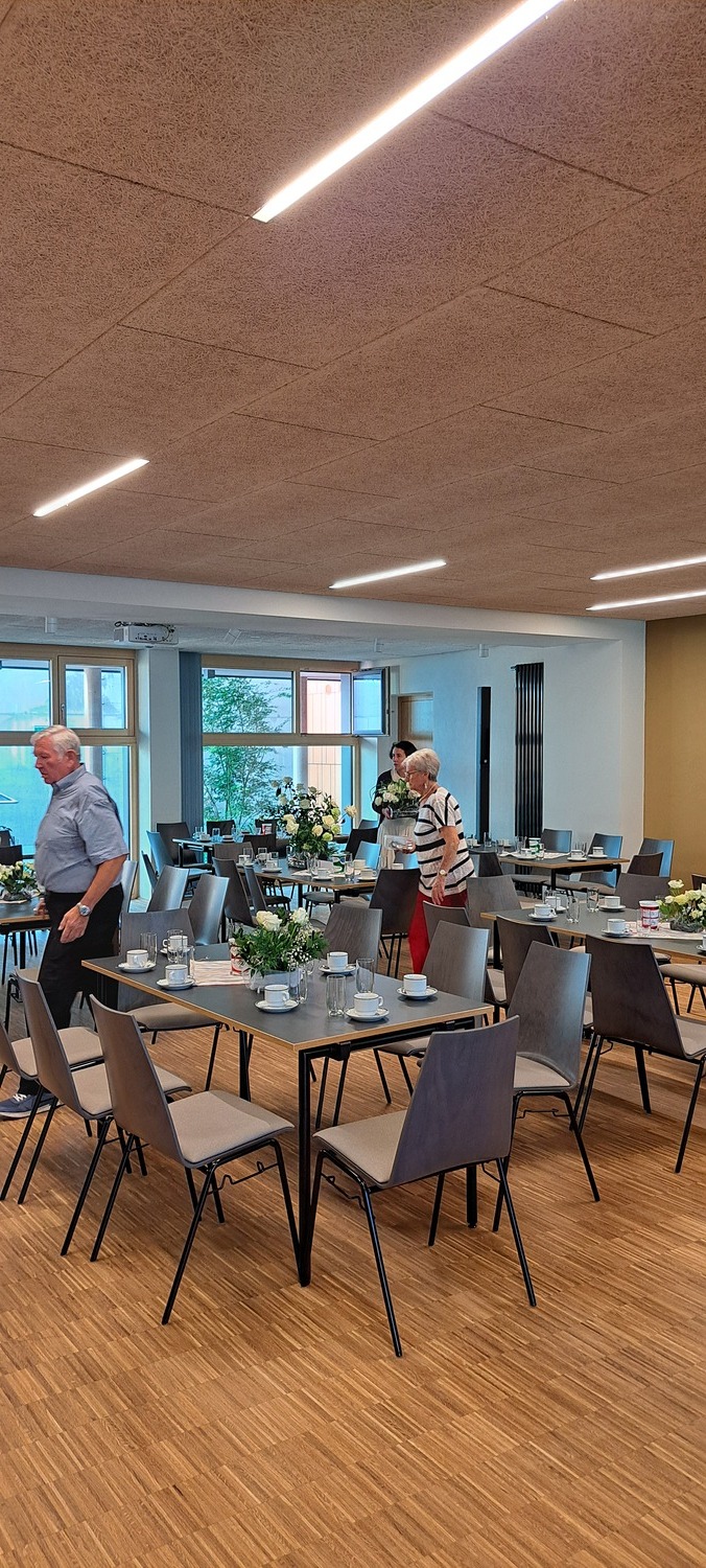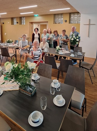 Danach lud die Bastelrunde Wolkersdorf, bestehend aus rund 20 Frauen, die sich einmal im Monat im Pfarrzentrum treffen, um für den Weihnachts- und Ostermarkt zu werken, herzlich zum Pfarrcafé ein. Es war sehr gut besucht und bot Gelegenheit zu Begegnung und Austausch. Neben köstlichem, selbstgemachtem Kuchen sorgte ein zauberhafter Blumenschmuck – ein Geschenk des Brautpaares von der Hochzeit am Vortag – für festliche Atmosphäre.