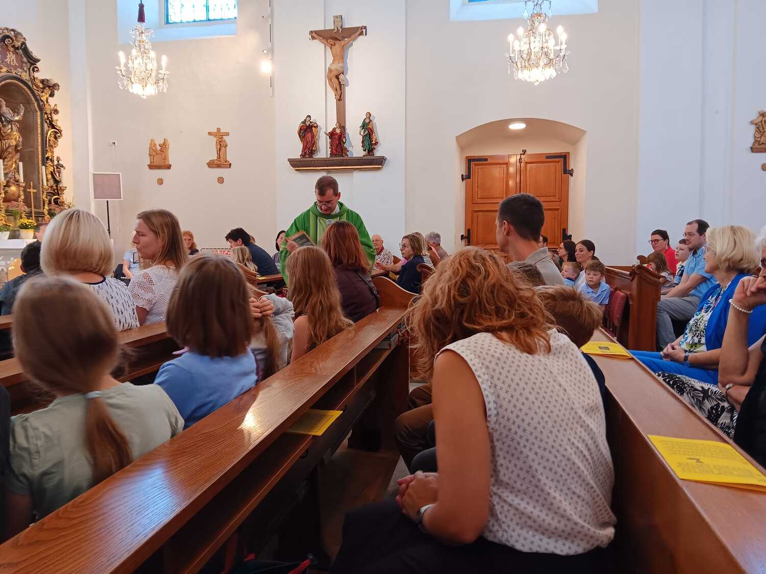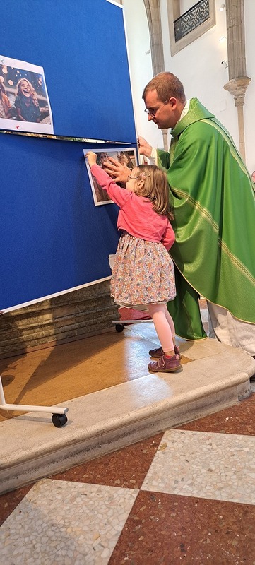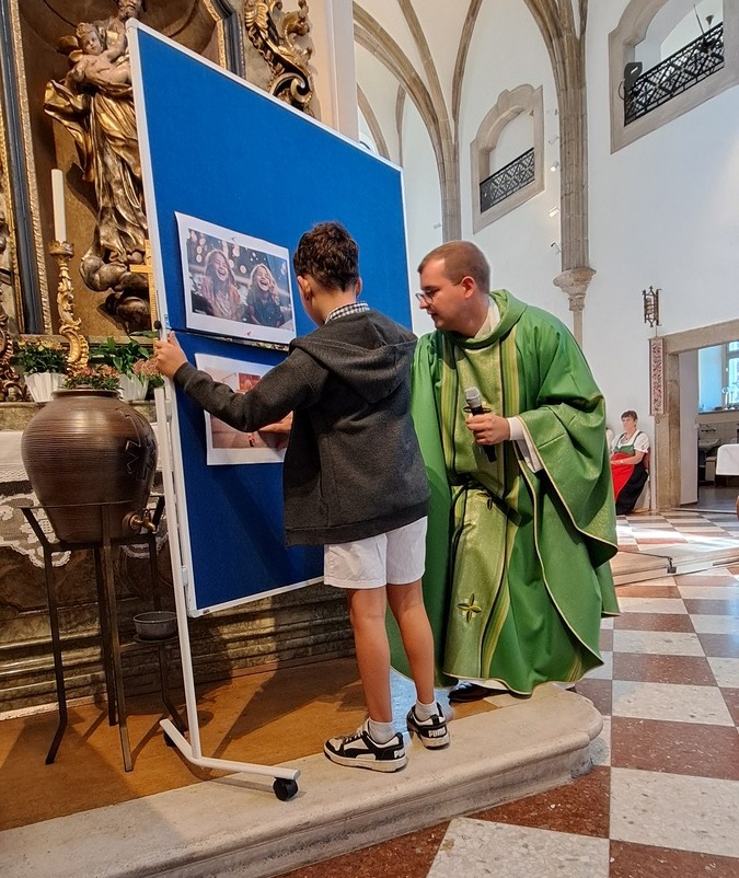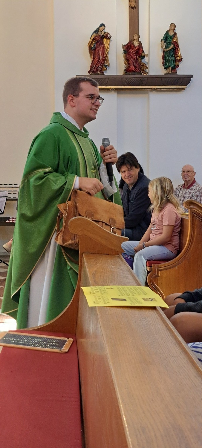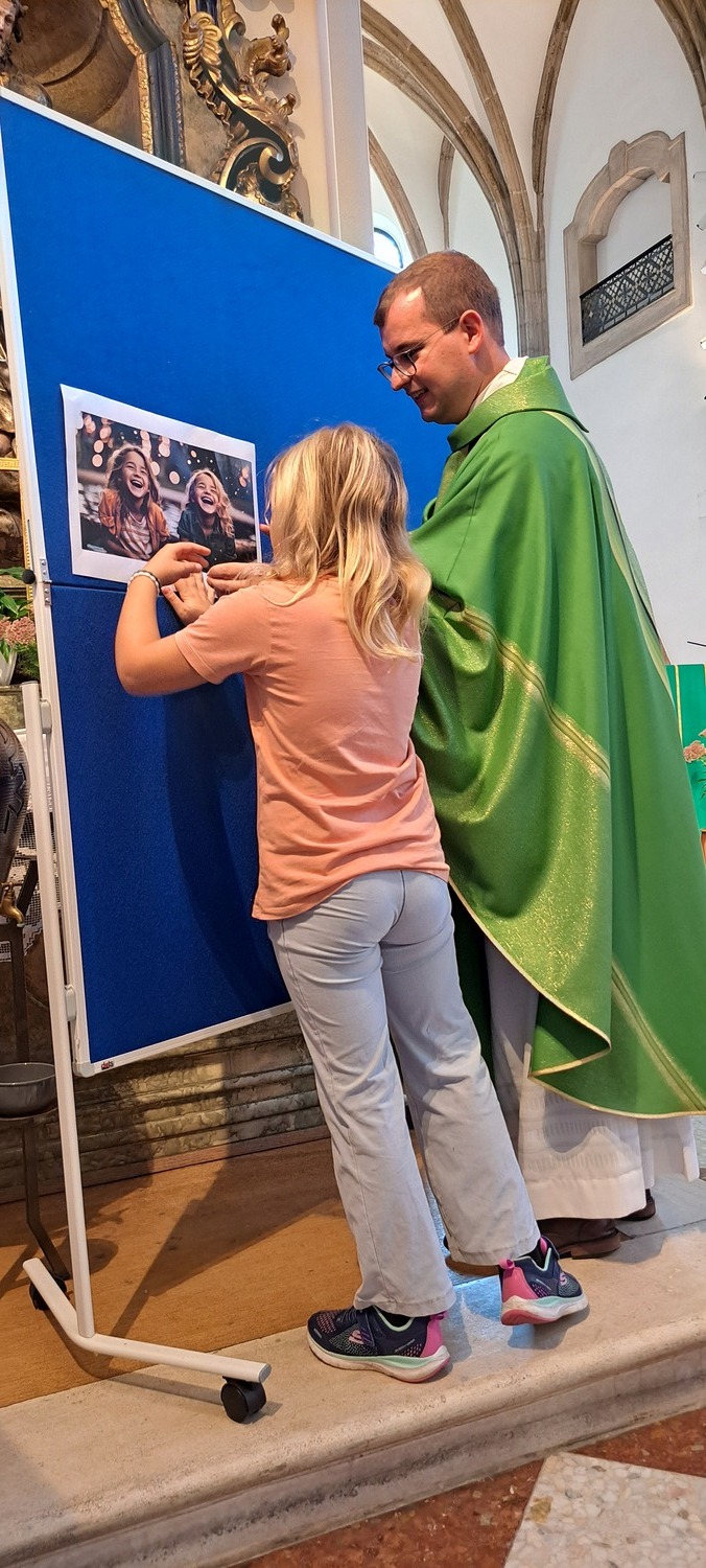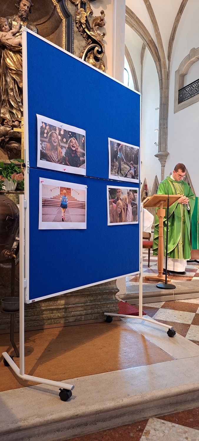 Ein besonderer Moment war, als die Kinder mit ihren Schultaschen nach vorne zum Altar kamen und dort den Segen empfingen. Eine zunächst leere Pinwand wurde gemeinsam mit Bildern gefüllt, die zeigten, was neben Heften, Büchern und Schreibwaren noch alles in eine „Schultasche“ gehört: Freundschaften, gegenseitige Hilfe, Achtsamkeit am Schulweg, aber auch Lachen und Lebensfreude. Pfarrprovisor Thorsten hatte zudem eine alte Schultasche und eine Kreidetafel mitgebracht und erzählte Geschichten aus seiner eigenen Schulzeit – zur großen Freude von Kindern und Erwachsenen.