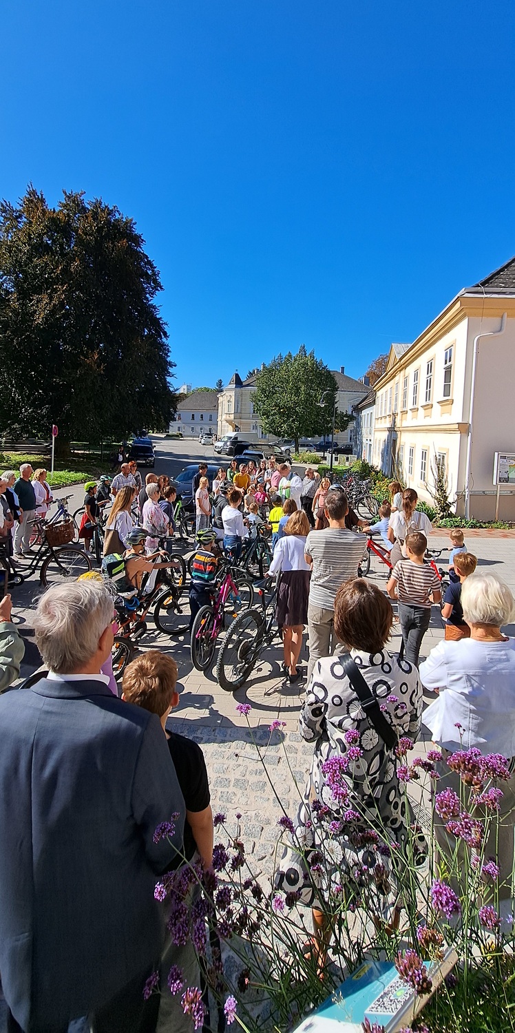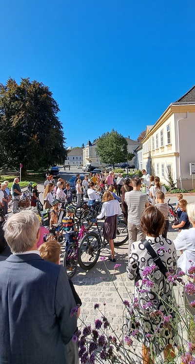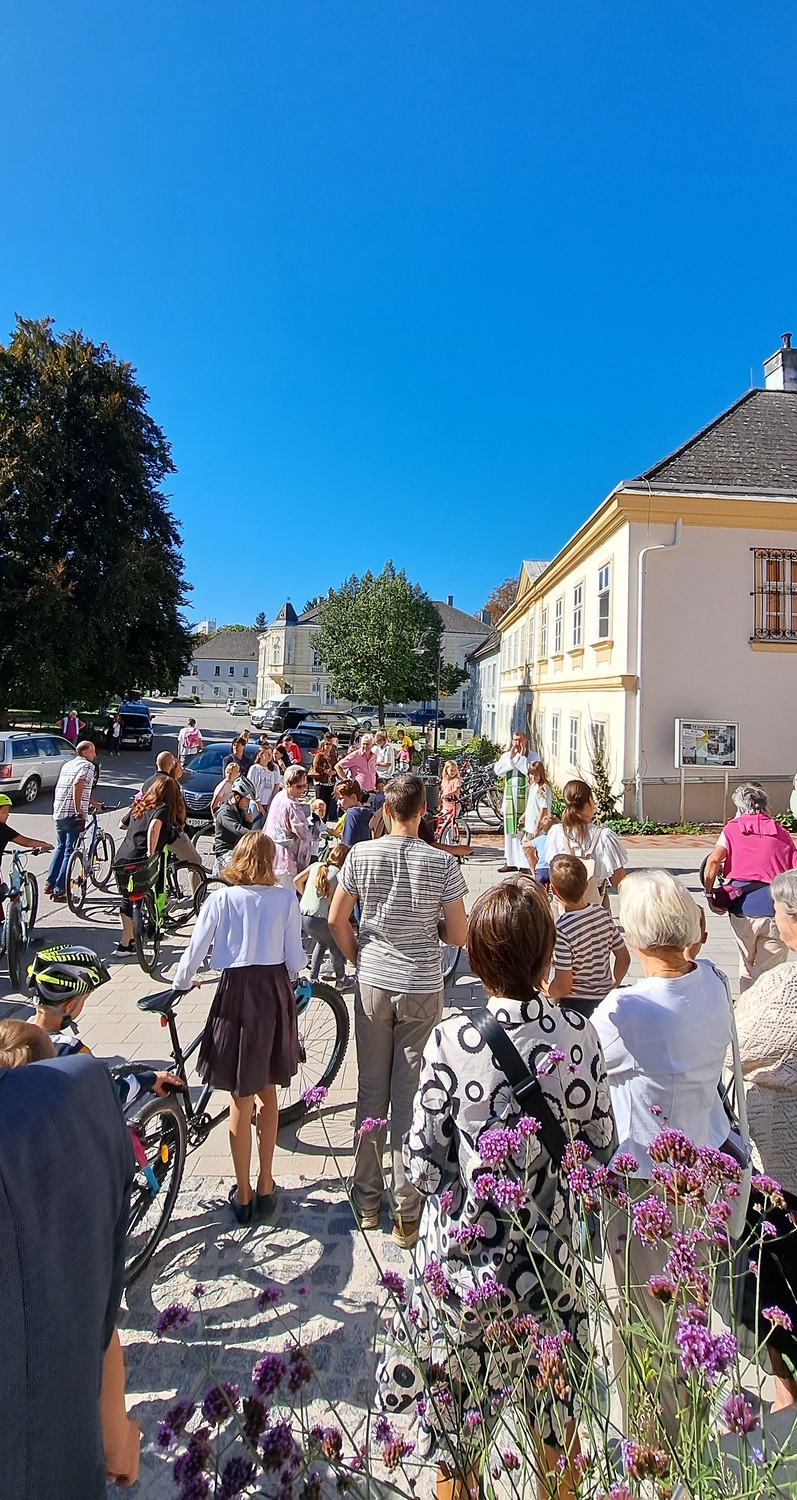 Im Anschluss an den Gottesdienst fand auch die Fahrradsegnung statt. Im Rahmen der Europäischen Mobilitätswoche wurden wir an diesem Tag ermutigt, den Weg in die Kirche bewusst mit dem Fahrrad zurückzulegen. Besonders auch die Kinder sind eingeladen worden, mit ihren Fahr- oder Laufrädern zu kommen und damit ein Zeichen für eine klimafreundliche Zukunft zu setzen. Alle, die ein Fahrrad mitgebracht hatten, versammelten sich vor dem Quartier Wolkersdorf. Bei herrlich strahlend blauem Himmel sprach Pfarrprovisor Thorsten den Segen über die Fahrräder und ihre Fahrerinnen und Fahrer. Viele nahmen dieses Angebot dankbar an – ein sichtbares Zeichen dafür, dass Gott uns nicht nur im Schulalltag, sondern auch unterwegs begleitet und behütet.