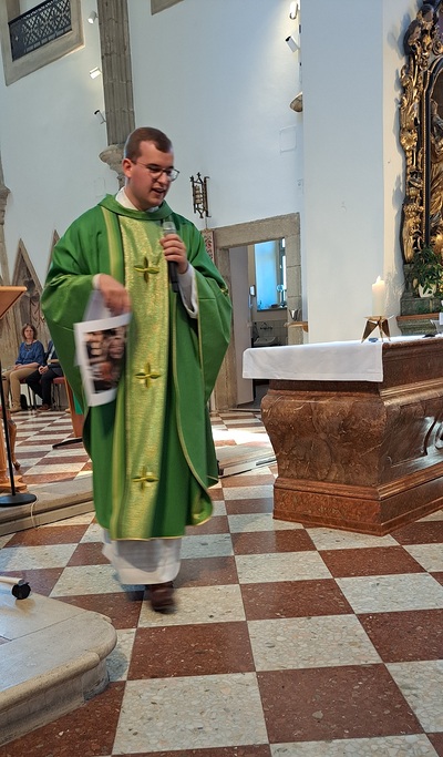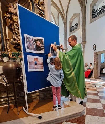 Ein besonderer Moment war, als die Kinder mit ihren Schultaschen nach vorne zum Altar kamen und dort den Segen empfingen. Eine zunächst leere Pinwand wurde gemeinsam mit Bildern gefüllt, die zeigten, was neben Heften, Büchern und Schreibwaren noch alles in eine „Schultasche“ gehört: Freundschaften, gegenseitige Hilfe, Achtsamkeit am Schulweg, aber auch Lachen und Lebensfreude. Pfarrprovisor Thorsten hatte zudem eine alte Schultasche und eine Kreidetafel mitgebracht und erzählte Geschichten aus seiner eigenen Schulzeit – zur großen Freude von Kindern und Erwachsenen.