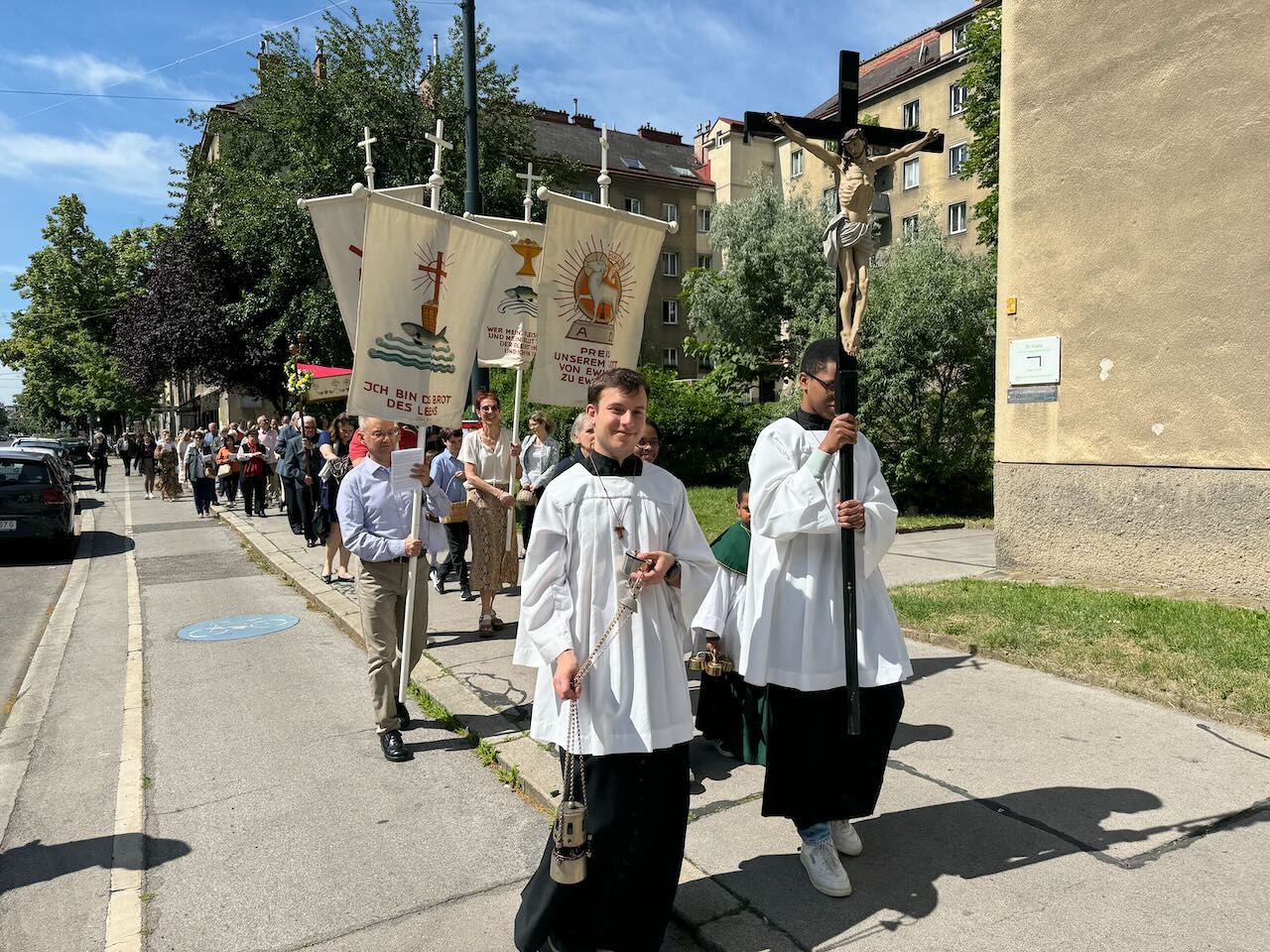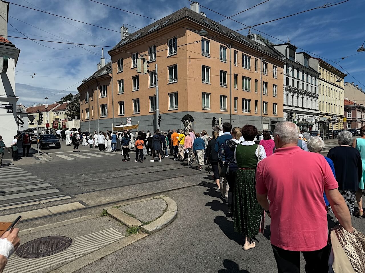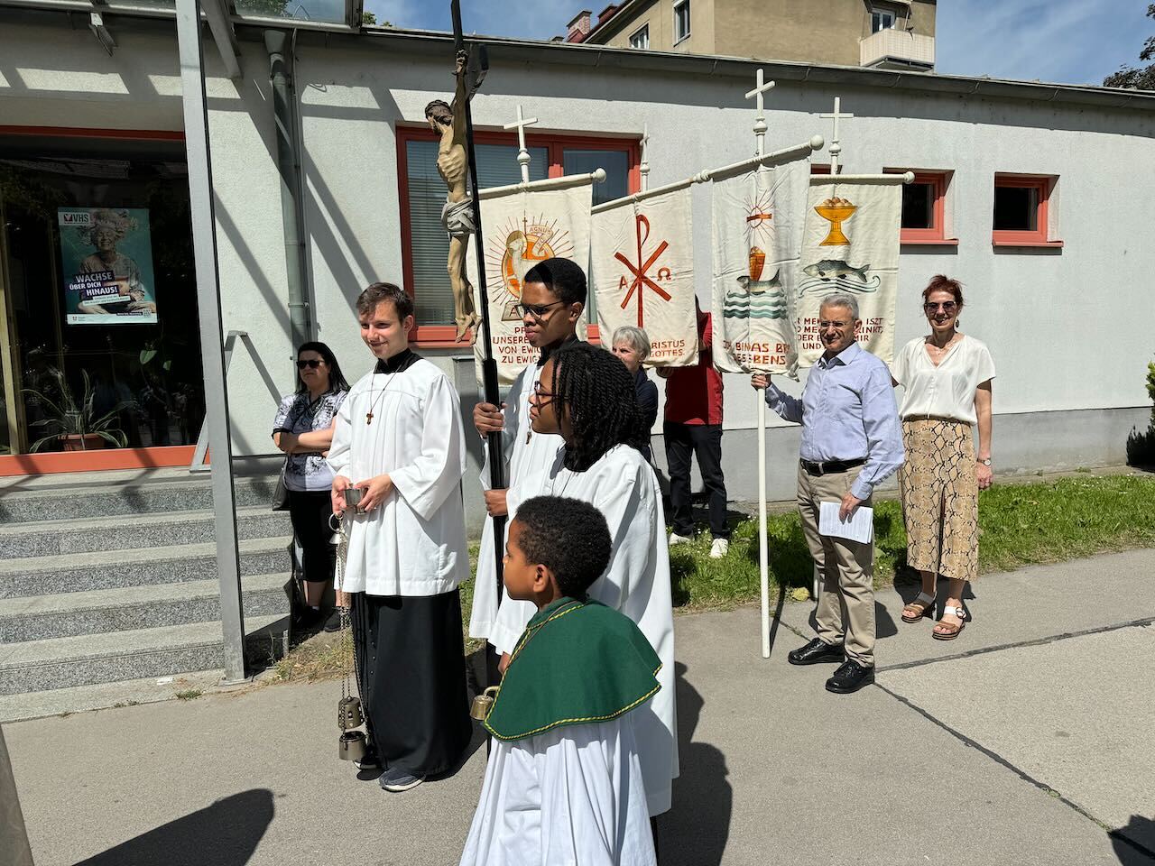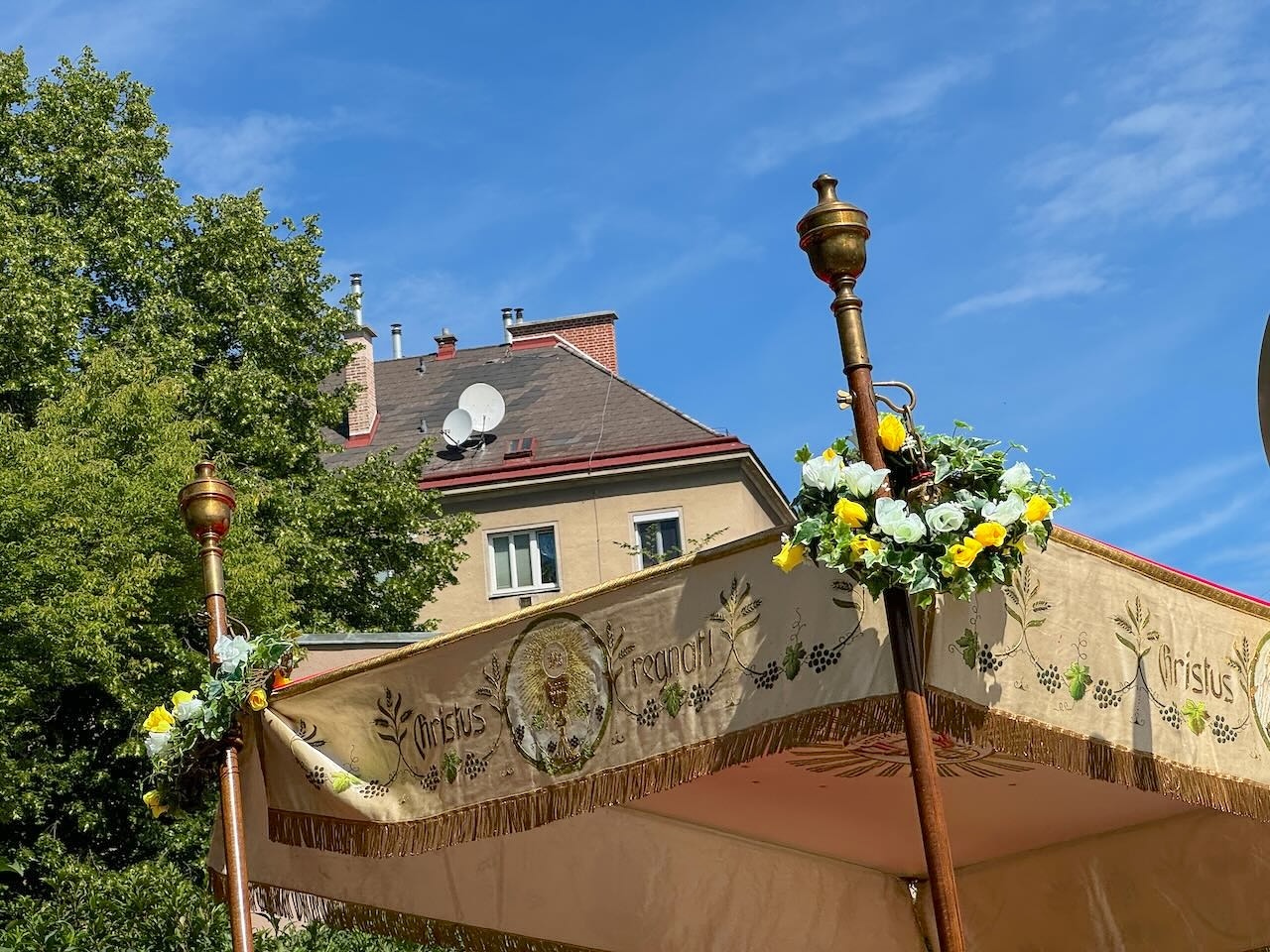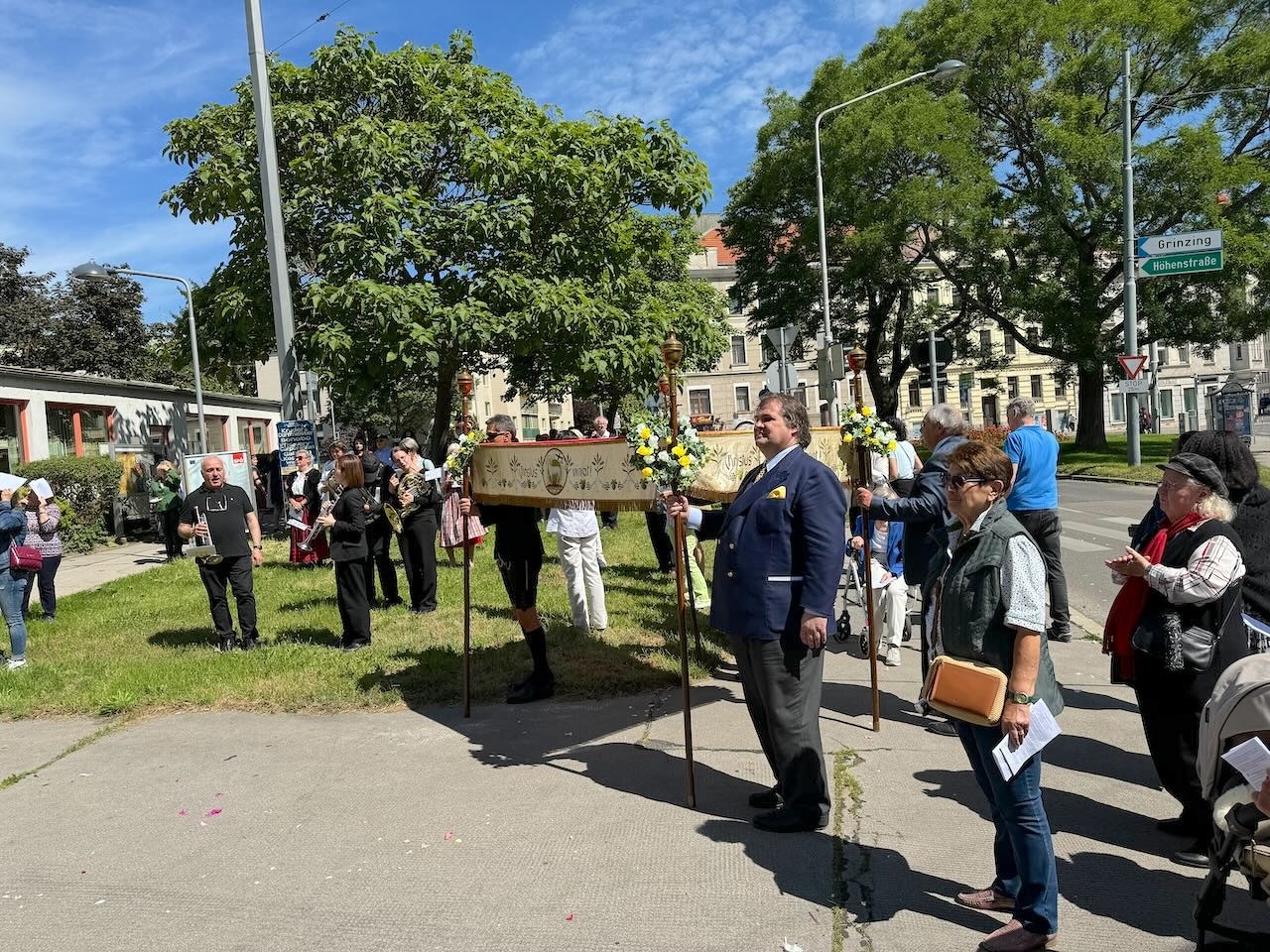 Am 30. Mai feierten wir wie jedes Jahr den Fronleichnamsgottesdienst am 12.-Februar-Platz. Gemeinsam mit Jesus, der uns in der eucharistischen Gestalt des Brotes begleitete, ging es dann in die Nußdorfer Pfarrkirche, wo der Vormittag festlich ausklang.