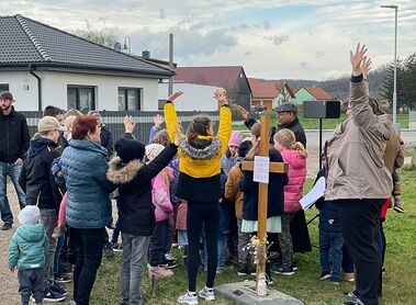 Jesus ist für uns am Kreuz gestorben, in jeder Kirche sehen wir auch ein Kreuz, das uns daran erinnert. Und er musste das Kreuz selber tragen. An das wollten wir uns beim Kinderkreuzweg erinnern.