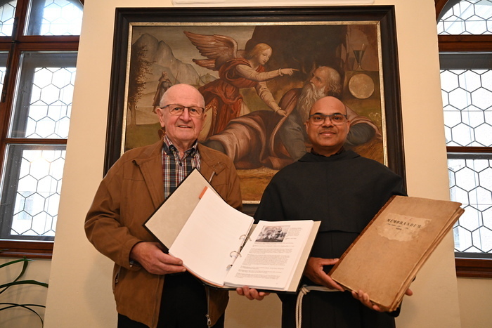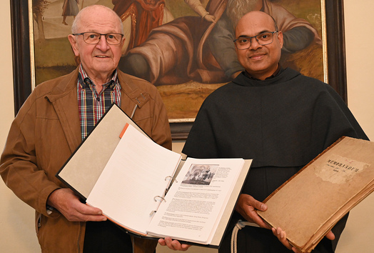 Die Geheimnisse der Michelstettner Pfarrchroniken entschlüsselte Otto Steindorfer in mühevoller Arbeit. Nun übergab er die Abschrift an unseren Pfarrer Nicholas Thenammakkal.