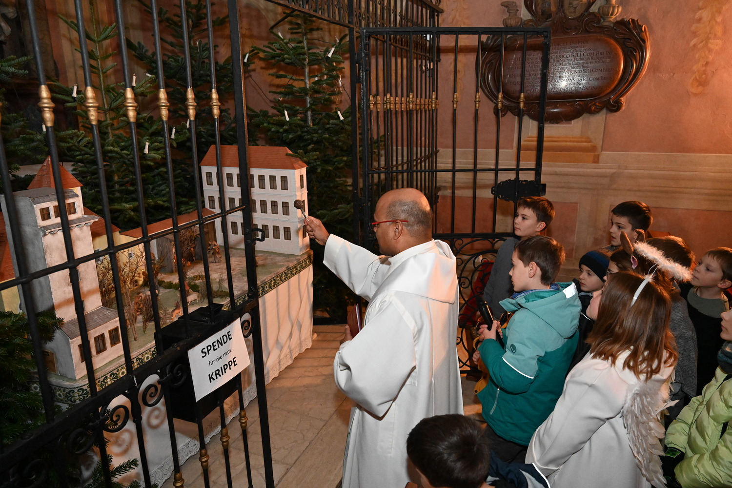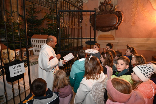 Im Rahmen der Kinderkrippenandacht am 24. Dezember 2024 segnete Pfarrer Nicholas Thenammakkal die neue Weihnachtskrippe. Viele Kinder waren bei diesem Moment dabei.