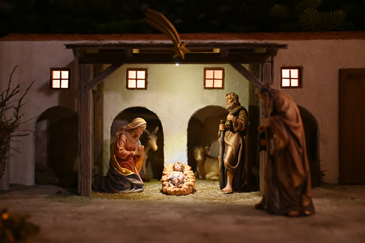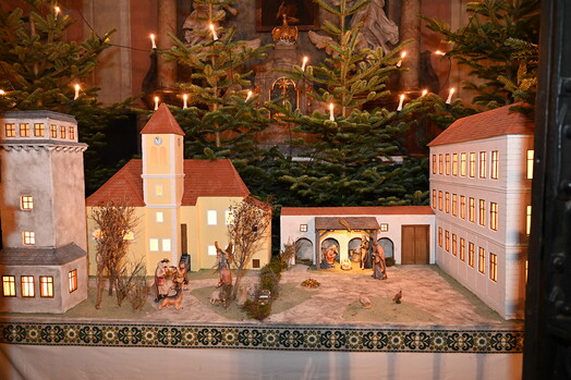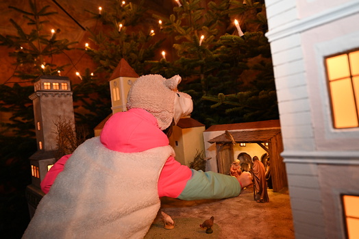Ein wichtiger Punkt war dabei, dass die Geburt Jesu in der Pfarre rund um das Minoritenkloster und die Kirche dargestellt werden soll. Die Geburt Jesu also bei uns im Weinviertel und damit weder eine Abendland-Krippe noch eine Alpenland Krippe. Die geschnitzten und bemalten Krippenfiguren stammen aus Südtirol.