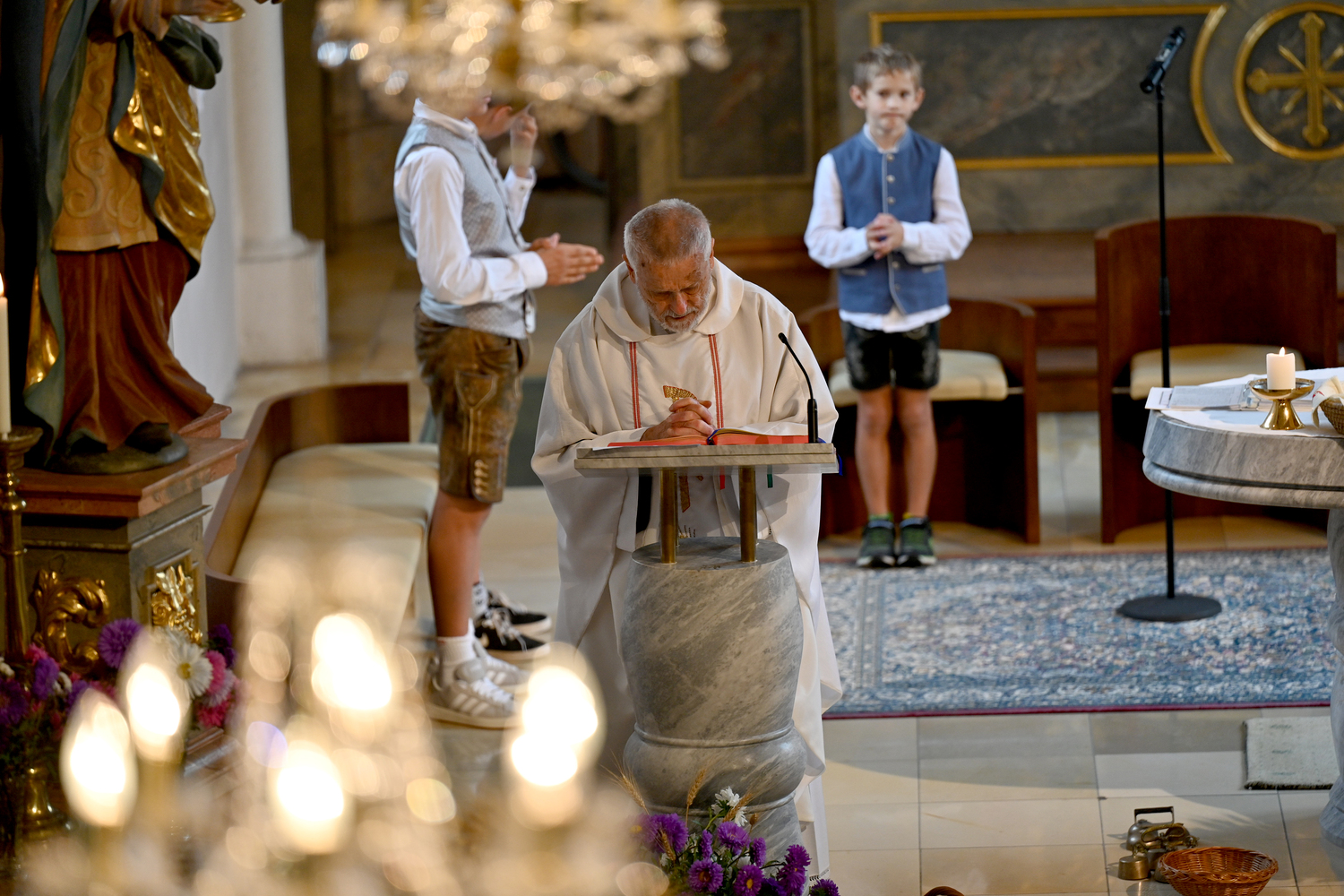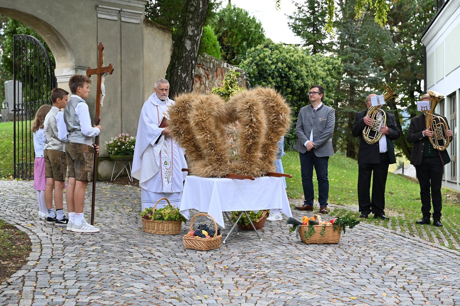 Pater Norbert Kalcher stand dem festlichen Erntedankfest in Gnadendorf als Zelebrant vor. Die Musikkapelle Gnadendorf spielte beim Eintreffen der Gottesdienstbesucher vor der Pfarrkirche bereits einige Märsche und die Feuerwehrleute waren ebenfalls ausgerückt.