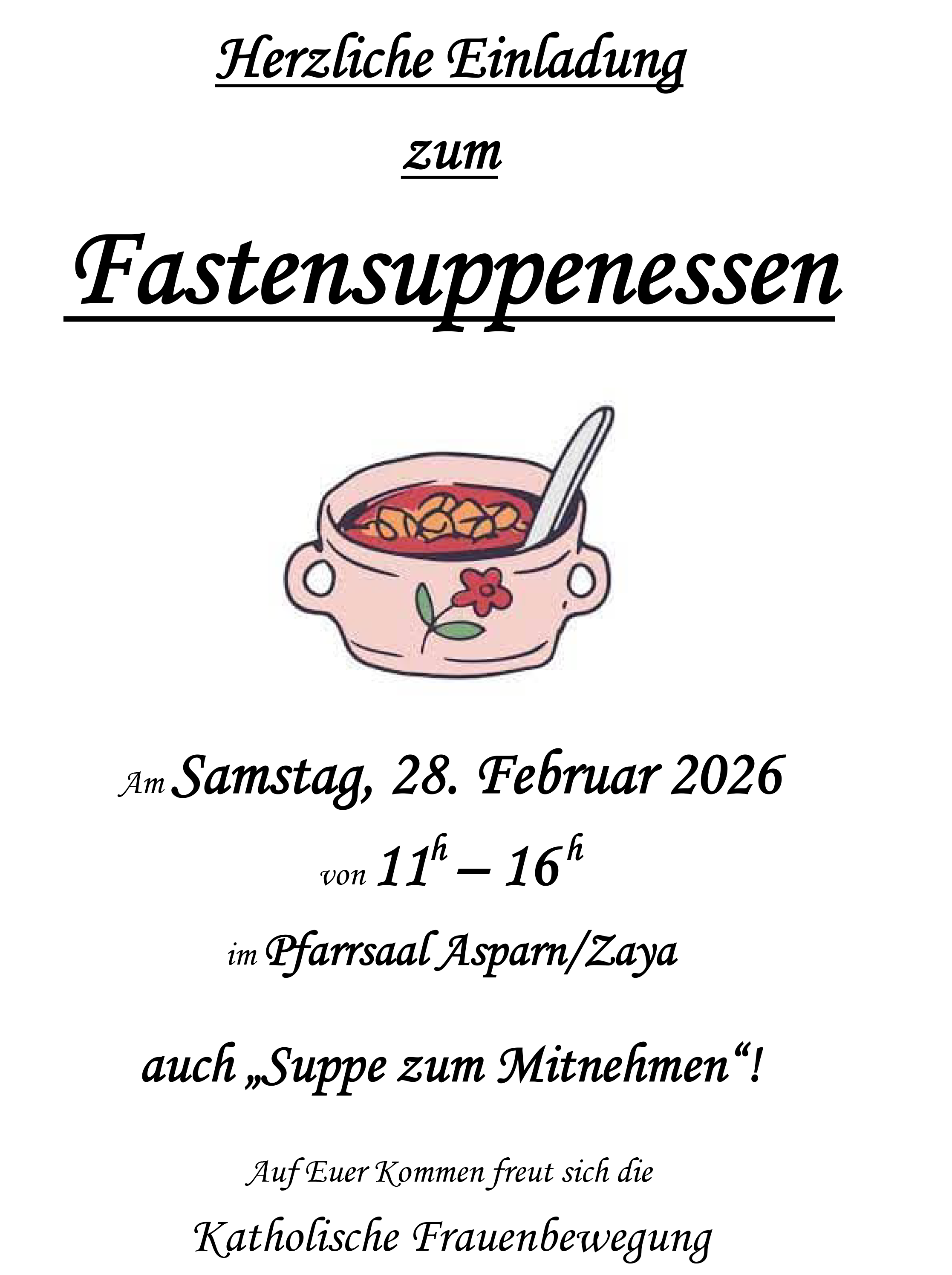 Herzliche Einladung zum Fastensuppenessen der Katholischen Frauenbewegung. Zum gleich Essen oder auch zum Mitnehmen.