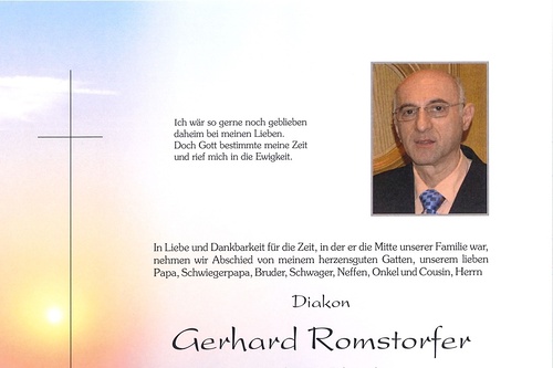 Wir trauern um unseren Diakon und Gnadendorfer Feuerwehrkurat Gerhard Romstorfer. Sein Engagement in der Pfarre und darüberhinaus im gesamten Pfarrverband wird vielen in ewiger Erinnerung bleiben. Seine Herzlichkeit, seine Hilfsbereitschaft und Zuverlässigkeit werden wir nie vergessen. Gerhard, wir sind dir Dankbar, für alles was du für unsere Pfarrgemeinde getan hast.