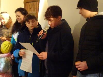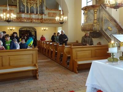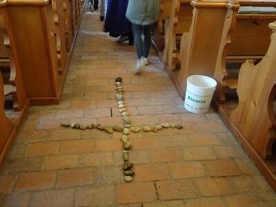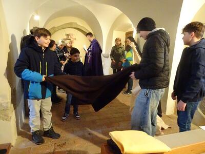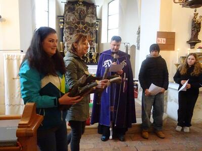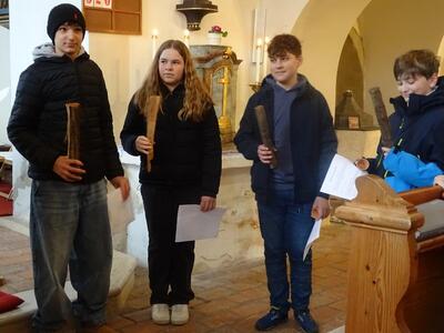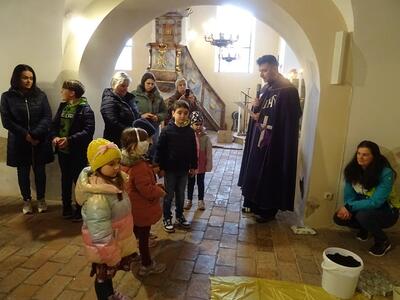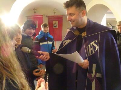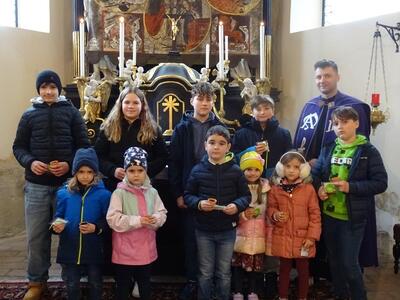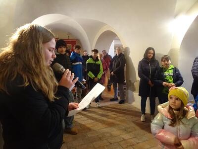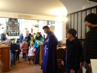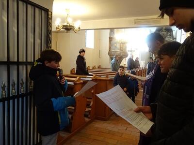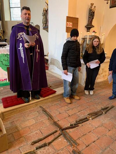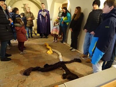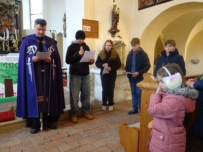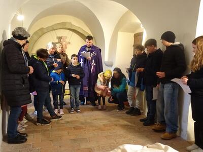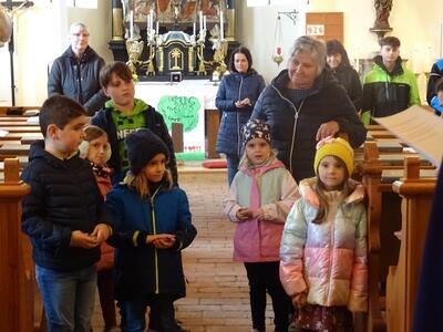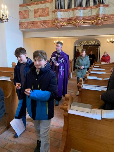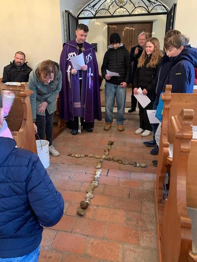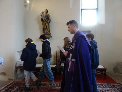 Straßenkreuzweg mit den Firmlingen, aufgrund Regens in der Kirche in Ameis.