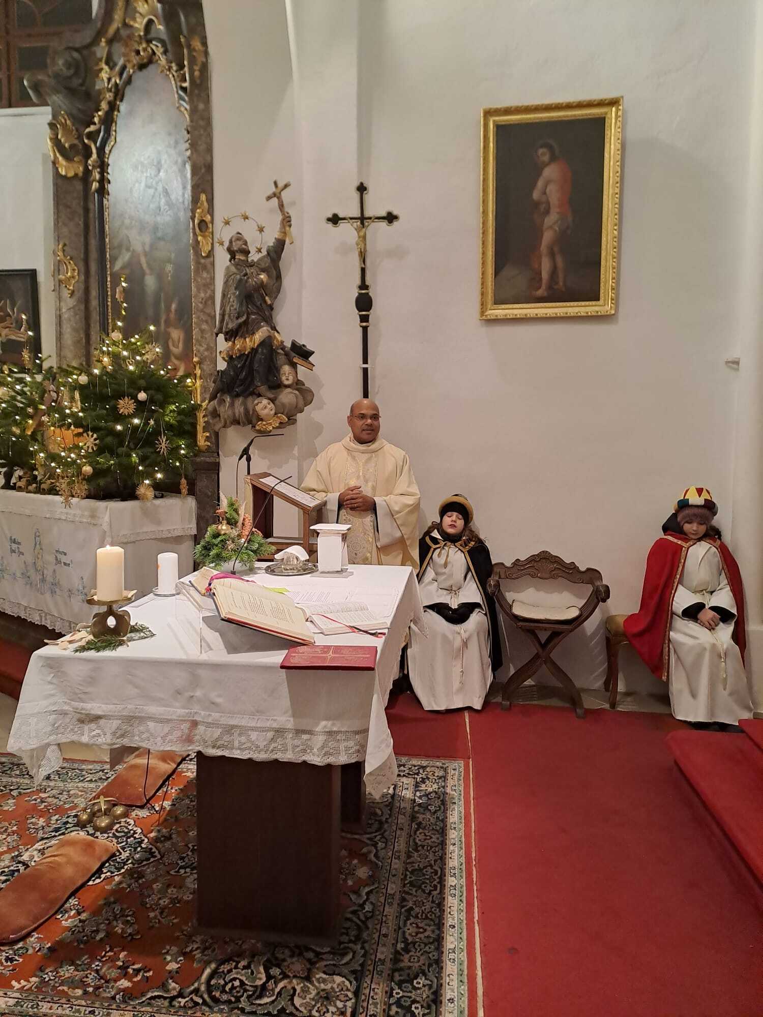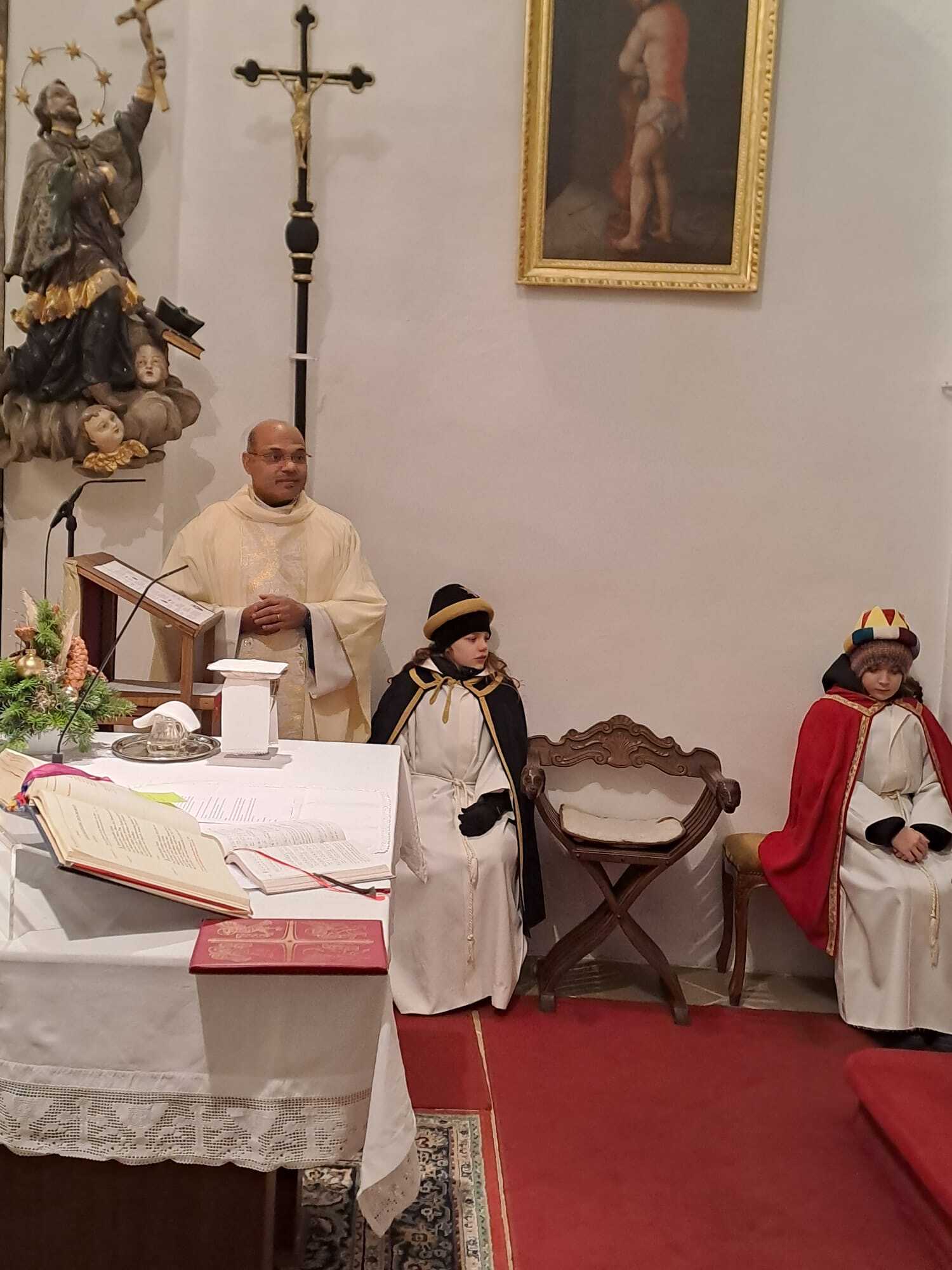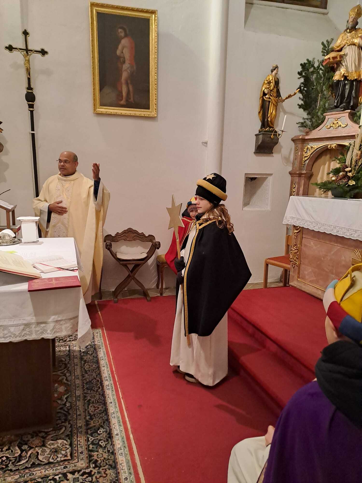 Pater Nicholas begrüße die Sternsinger beim Gottesdienst am Montag, den 5. Jänner in der Kirche in Föllim.