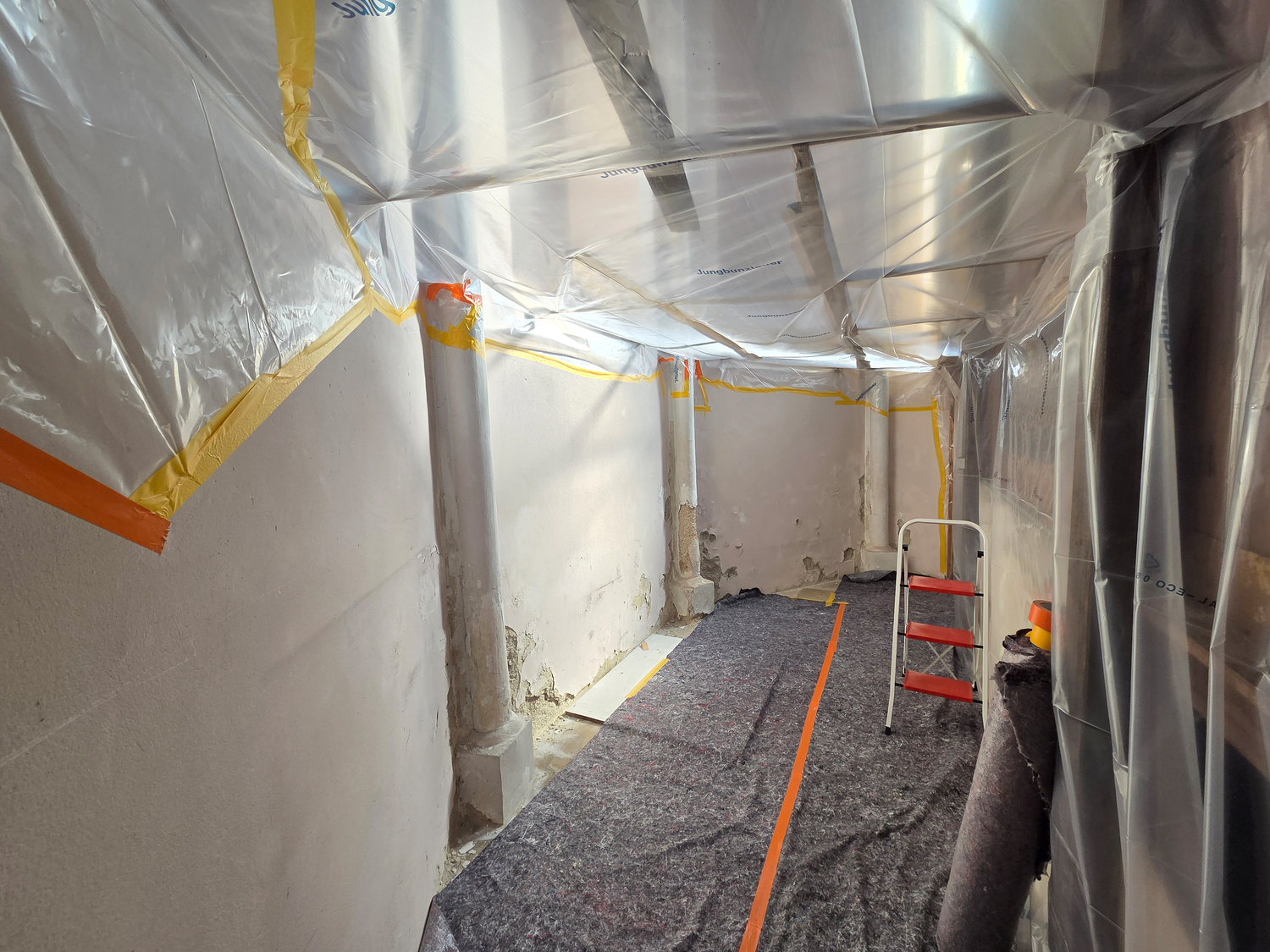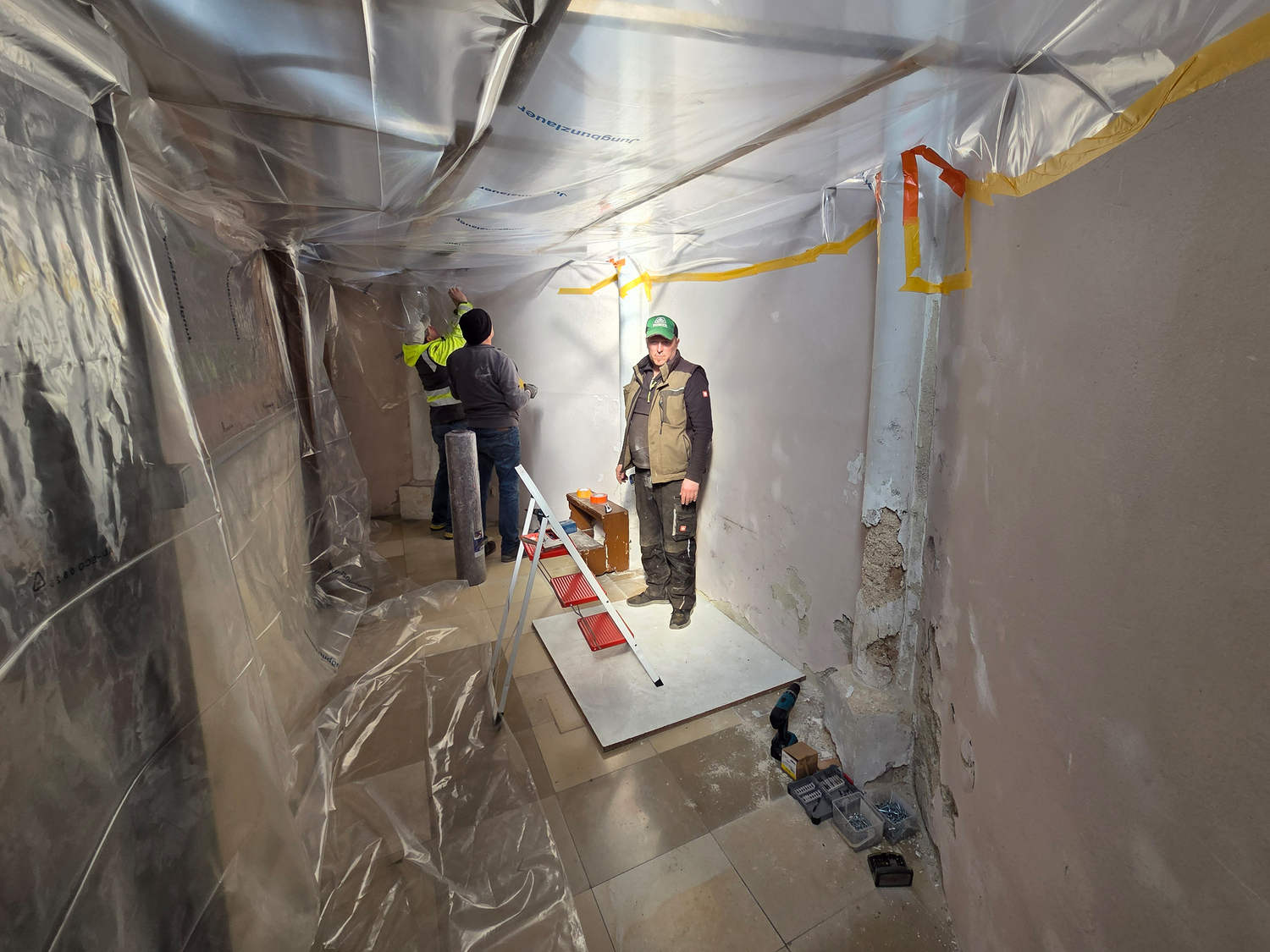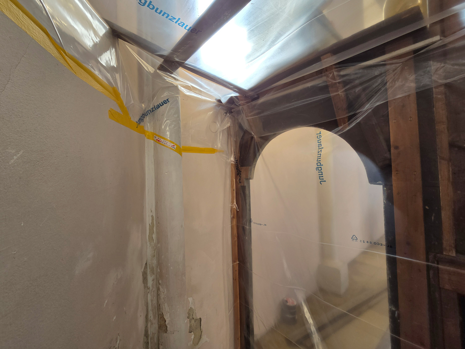 Für die Sanierung des Sockelbereichs hinter dem Hochaltar der Pfarrkirche Gnadendorf wurde als erster Schritt eine Staubdichte Ebene hergestellt.