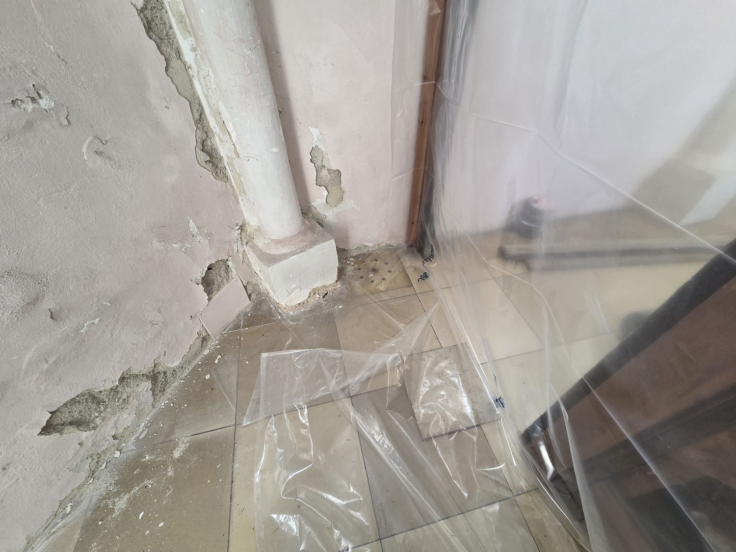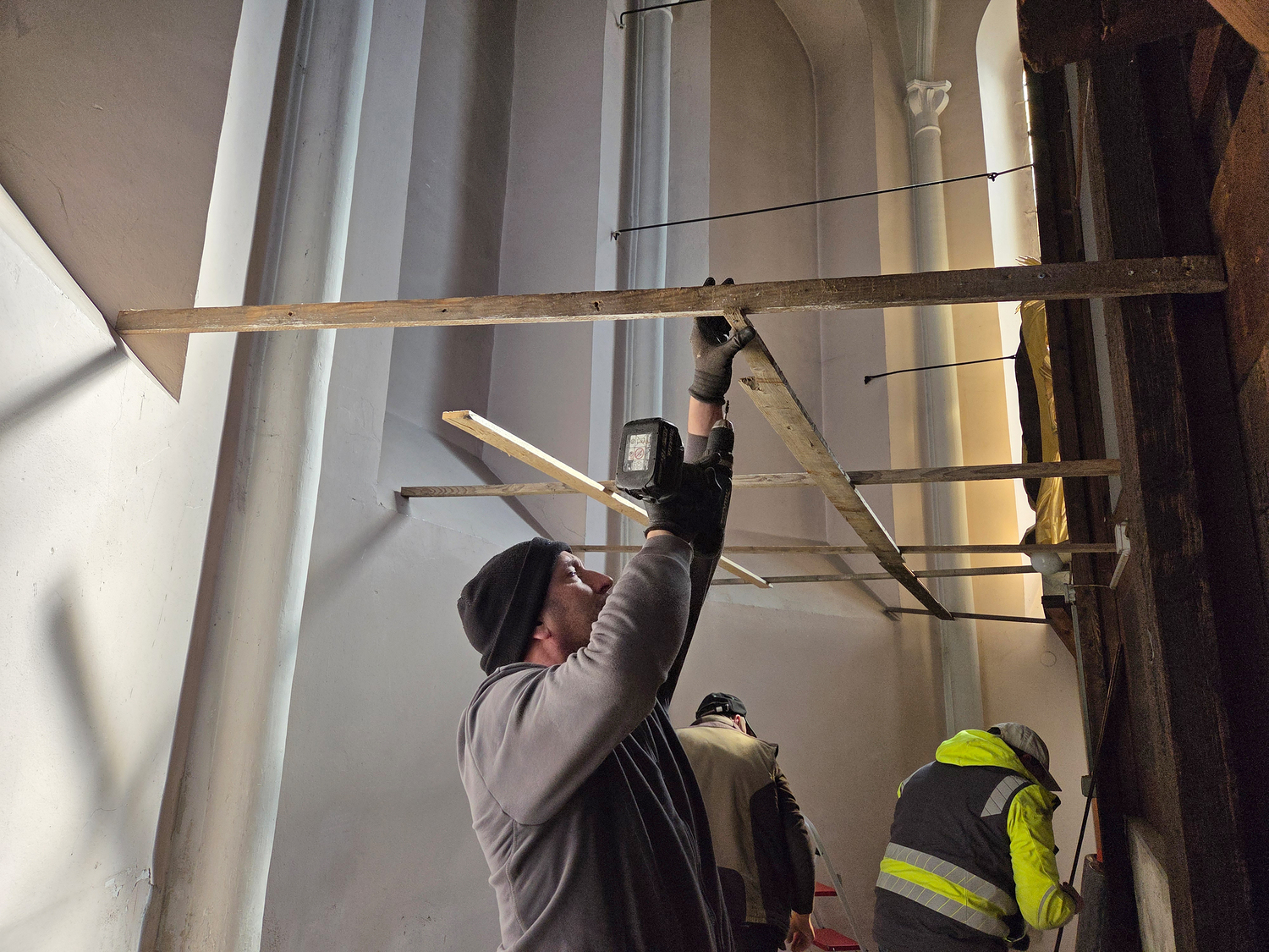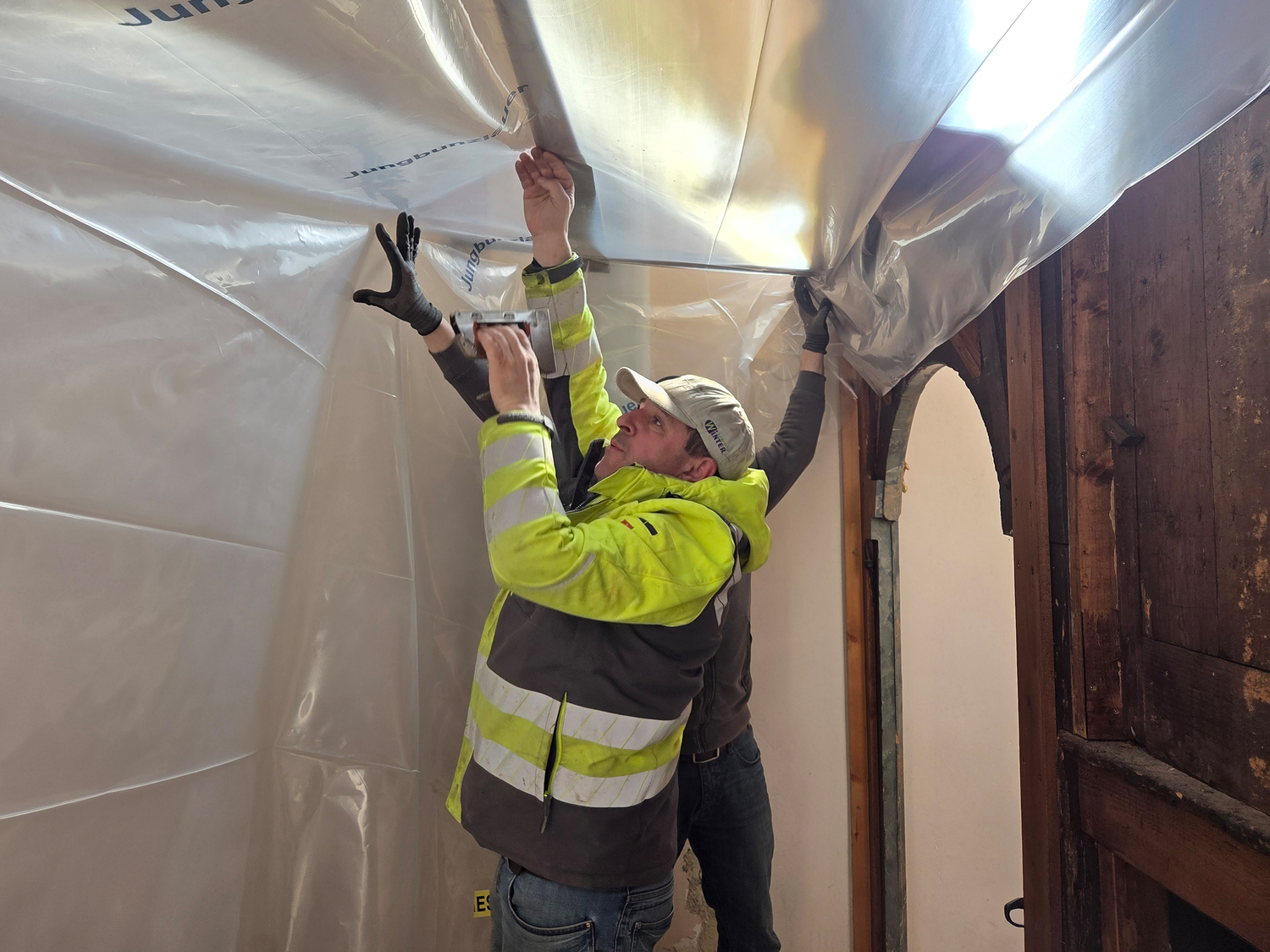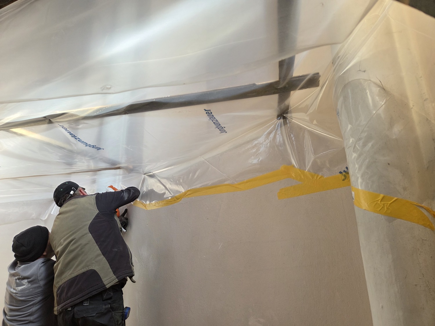 Für die Sanierung des Sockelbereichs hinter dem Hochaltar der Pfarrkirche Gnadendorf wurde als erster Schritt eine Staubdichte Ebene hergestellt.