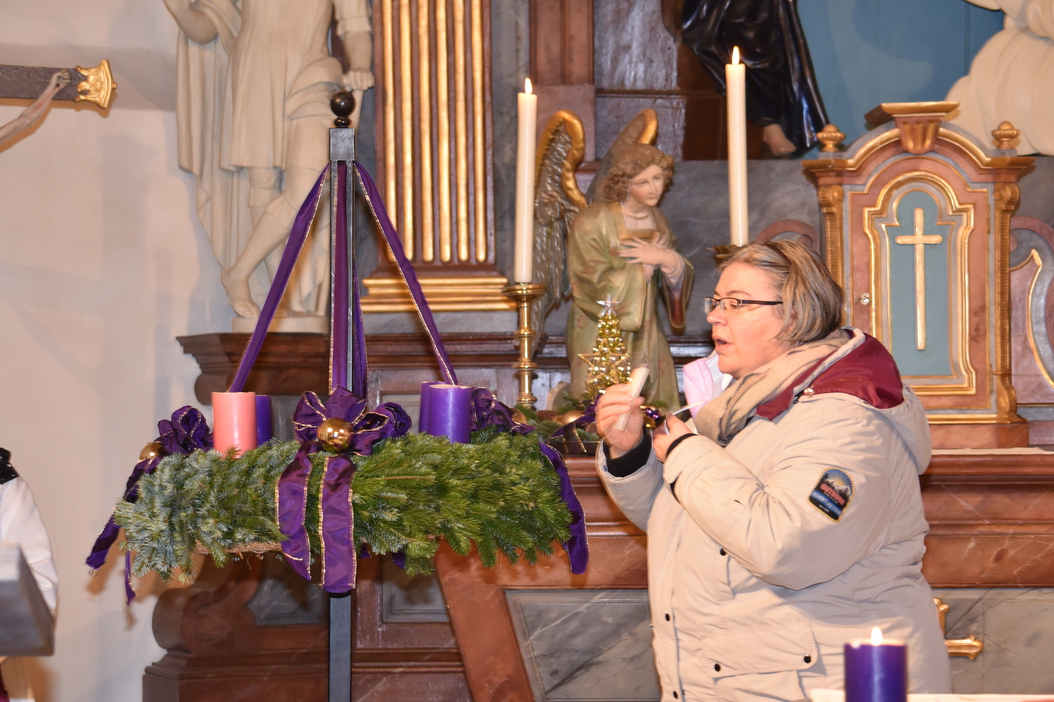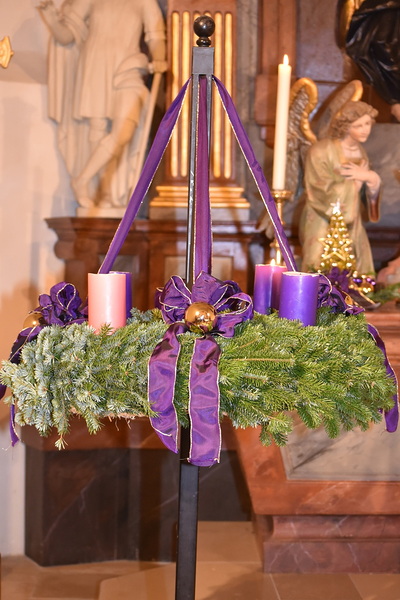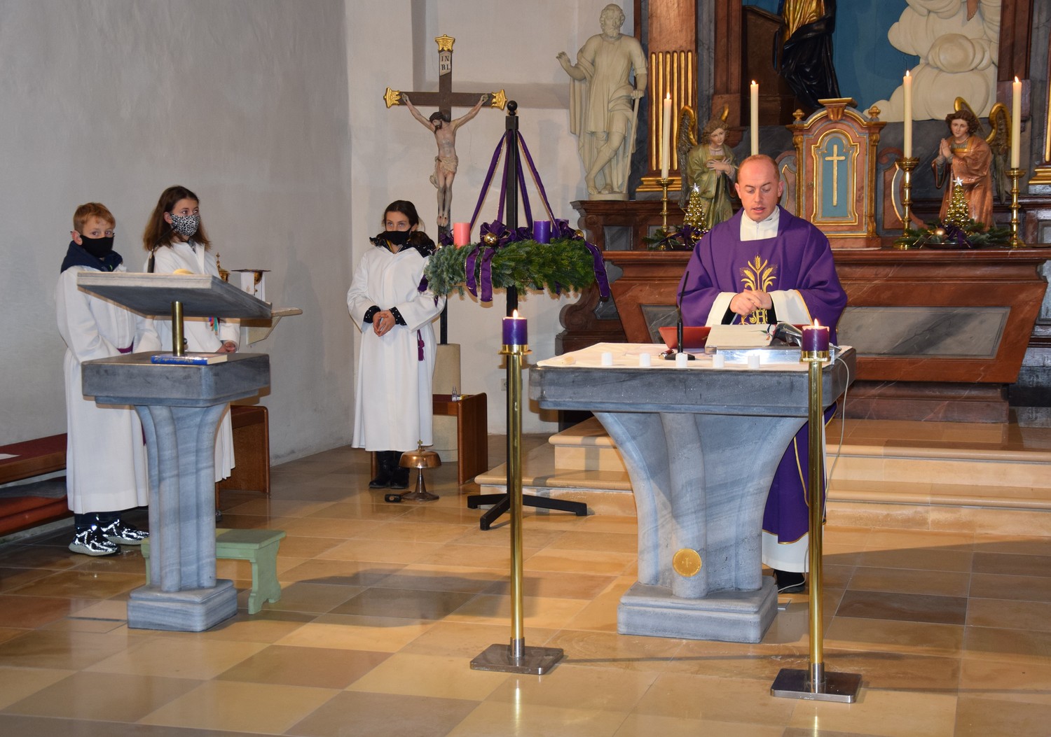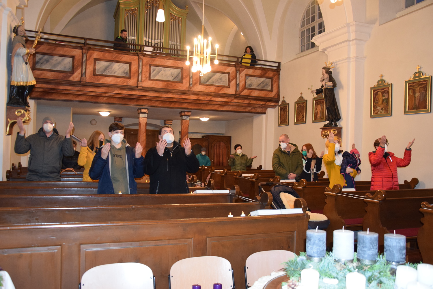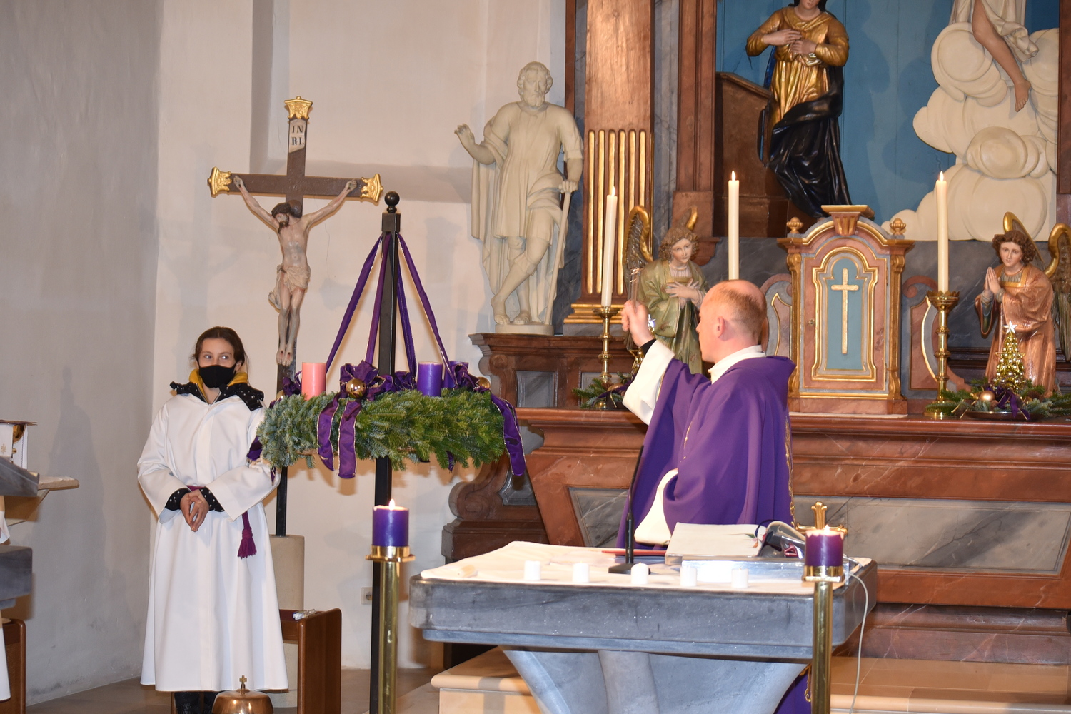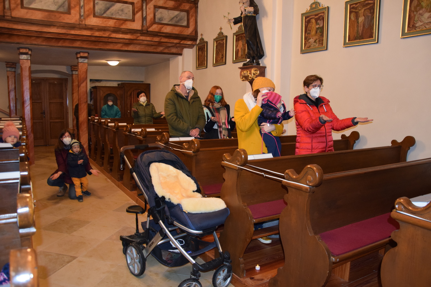 Am Samstag, 27. Nov. 2021 feierte P. Liviu eine Familienmesse mit Adventkranzsegnung. Die Ministranten Iris, Susanna und Philip gestalteten die Heilige Messe zum Thema "Jesus ist unser Licht". Iris und Susanna zeigten uns pantomimisch, wie wir Licht sein können und durch Umarmungen, durch Gespräche, durchs Teilen ein Lächeln ins Gesicht unserer Mitmenschen zaubern können. Um die Coronabestimmungen einzuhalten, untermalten die Heilige Messe nur Maria und Christine als Solistinnen des Generationenchores gesanglich, Hannah Madner spielte auf der Kirchenorgel, sodass die Adventstimmung in die Kirche getragen wurde. Ein herzliches Vergeltsgott allen Mitfeiernden!