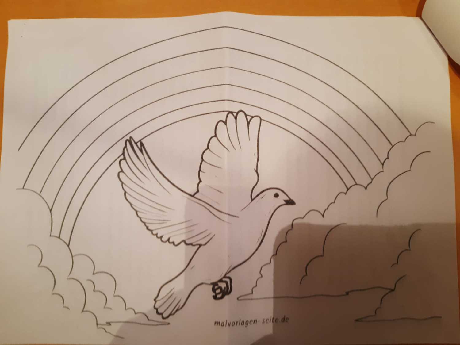 Eine Friedenstaube begleitet die Anwesenden mit der Bitte um Bemalung und Gestaltung nach Hause. Die Tauben werden nach der Bemalung in der Kirche aufgehängt.