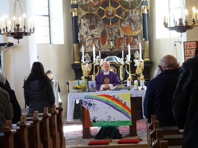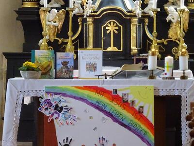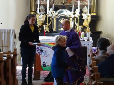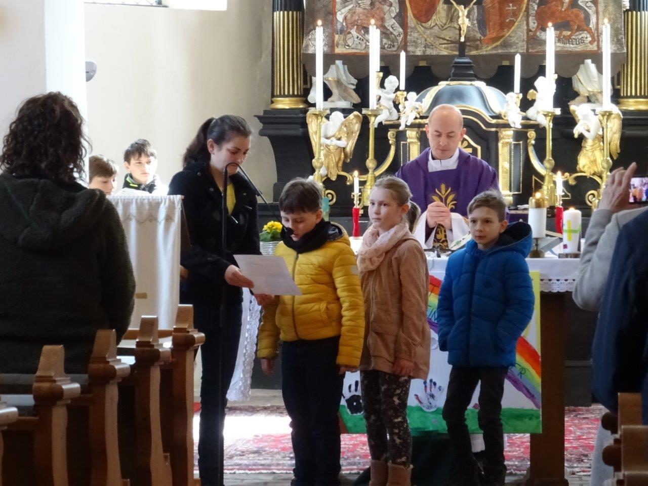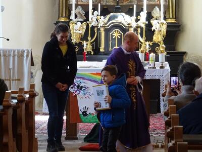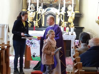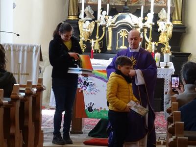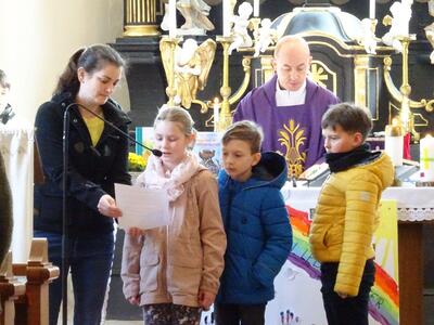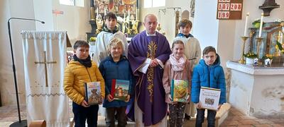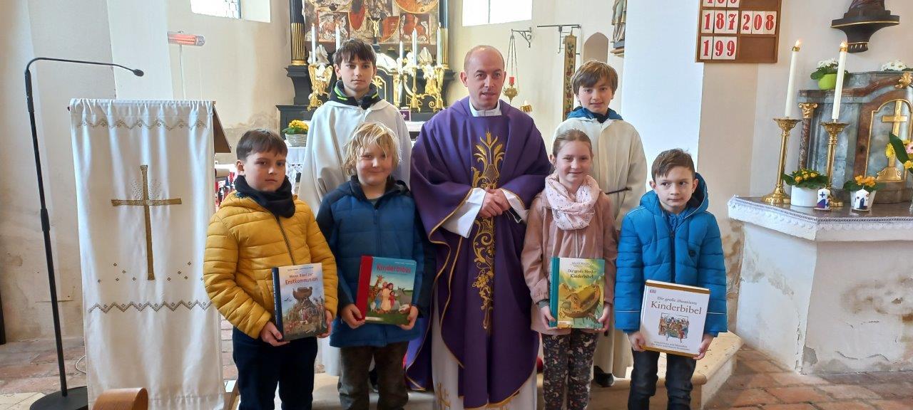 Bibelübergabe an die Erstkommunionkinder und Fastensuppenessen in der Pfarre Ameis, am Sonntag, den 19. März 2023.