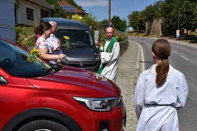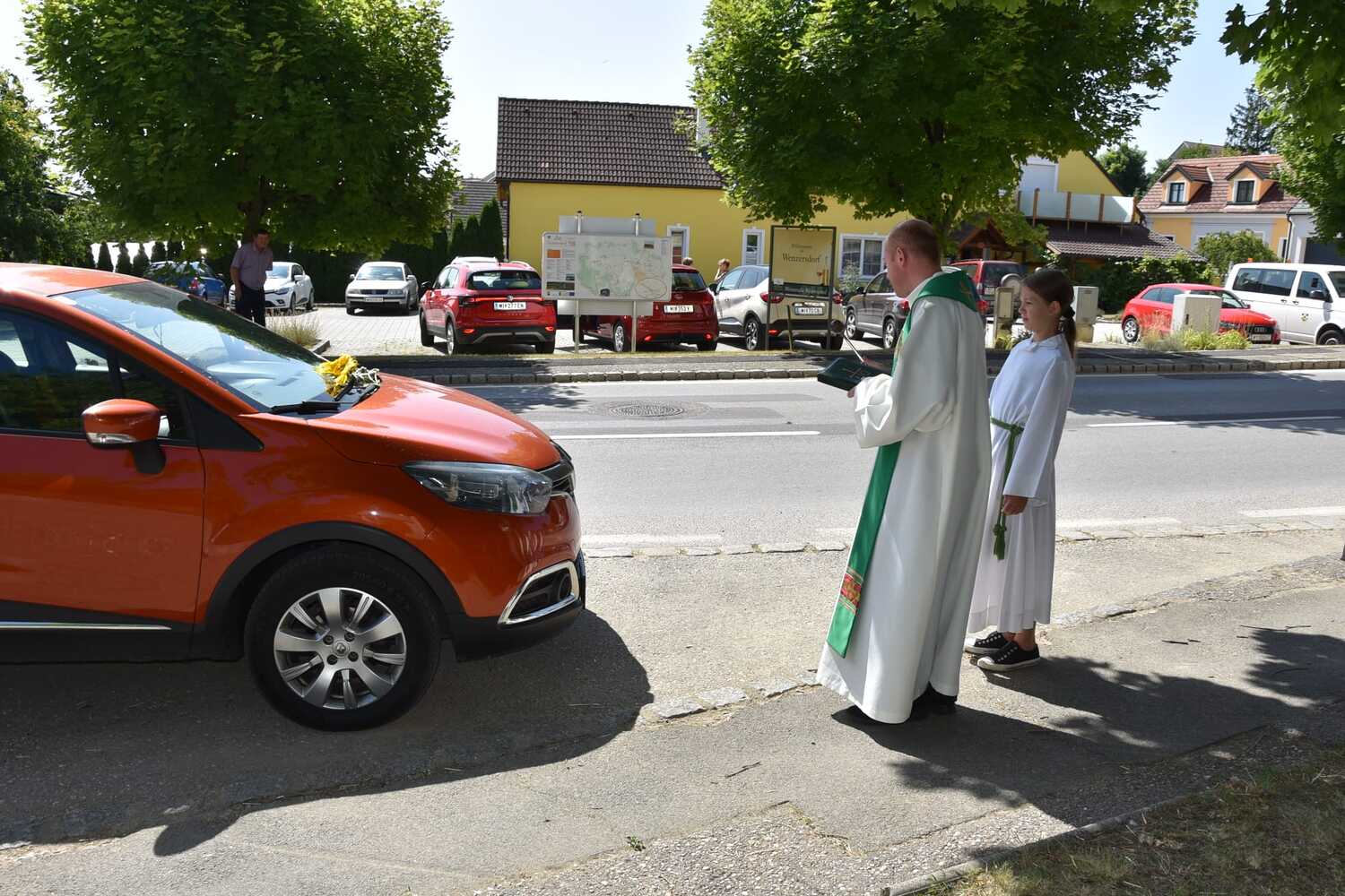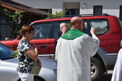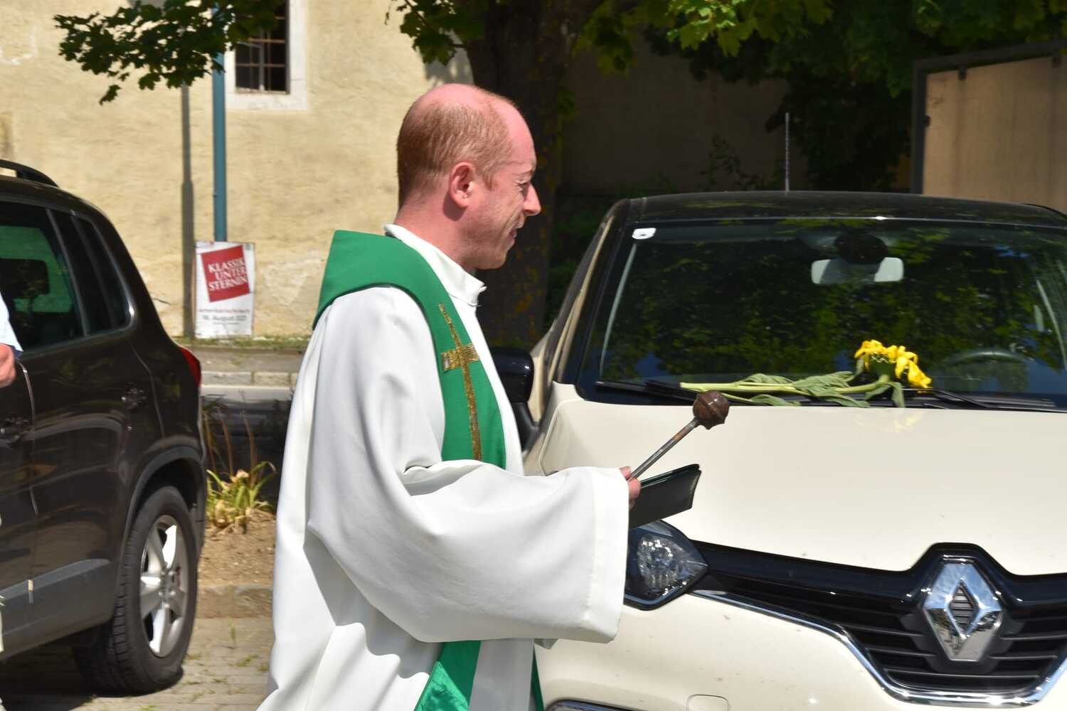 Pater Liviu segnete die Fahrzeuge der Gottesdienstbesucher in Wenzersdorf.