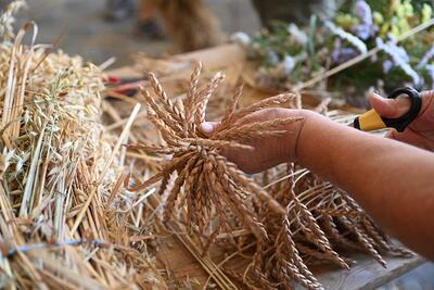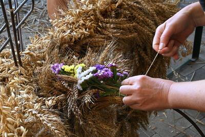 Viele Handgriffe sind notwendig, bis die Erntekrone fertiggestellt ist.