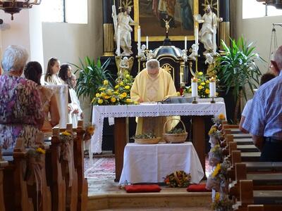 15. August 2022 Kräutersegnung in Ameis Im Rahmen des Gottesdienstes segnete Pater Norbert auch die vorbereiteten Kräuter. zu den Bildern: Kräutersegnung in Ameis
