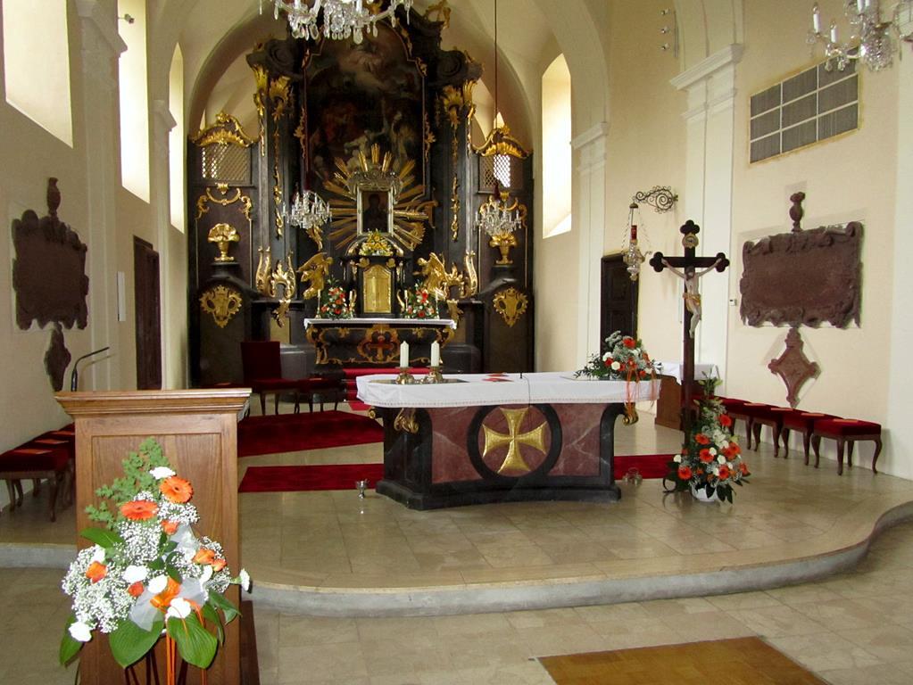 Der Hochaltar - eine Stiftung von Graf Wenzel Breuner, wurde 1765 vom Asparner Tischler Anton Hardtmuth gebaut. Links und rechts befinden sich Opfergangsportale mit reichem Rokokoschmuck.