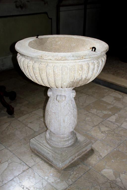 Taufstein aus Kalkstein, aus dem 16. Jahrhundert, mit Muschelmuster am Becken und Akanthusblattverzierungen am Fuß.