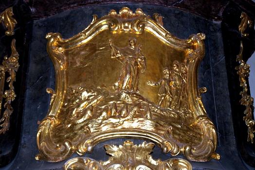 Am Korb sieht man ein vergoldetes Relief, das die Fischpredigt des hl Antonius darstellt, links und rechts befindet sich je ein Putte mit einem Buch bzw. mit den Gesetzestafeln. Obenauf steht die Statue des predigenden und lehrenden Christus.