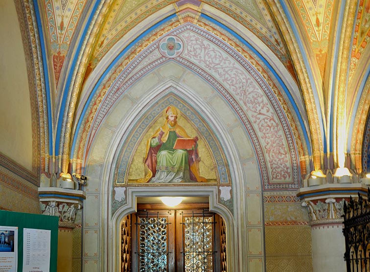 „Wer ist der Heilige da?“, fragt Tobias. „Ich weiß es leider nicht“, muss ich gestehen: „Aber ich werde mich schlau machen, mein Schatz. Ich denke, es könnte der hl. Augustinus sein – so mit Bischofsmütze, Buch und Feder.“ „Und das wäre hier im Augustinerstift ja auch noch sehr passend“, sagt Tobias: „Wenn gerade er die Menschen am Eingang der Stiftskirche begrüßen würde.“