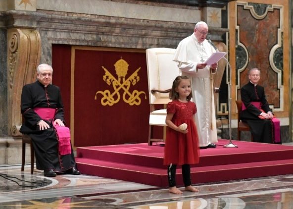 "Ich freue mich, eure Gesichter zu sehen, und ich lese es in euren Augen, dass auch ihr glücklich seid, ein wenig hier bei mir zu sein", wandte sich der Papst an die Kinder. "Gott hat die Welt mit einer großen Vielfalt von Blumen aller Farben geschaffen. Jede Blume hat ihre Schönheit, die einzigartig ist. Auch jeder von uns ist in Gottes Augen schön, und Gott hat uns gern. Deshalb fühlen wir das Bedürfnis, Gott Danke zu sagen. Danke für das Geschenk des Lebens, Danke für alle Geschöpfe! Danke für Mama und Papa! Danke für unsere Familien", sagte Franziskus.
