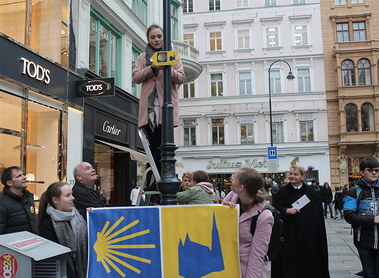 Wissen Sie, dass Sie gerade auf dem Jakobsweg gehen? Schülerinnen und Schüler der 6.Klassen des Schottengymnasiums montieren die ersten Schilder des Wiener Jakobsweg durch Wien.