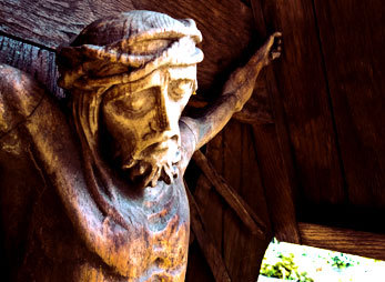 Er trug sein Kreuz und ging hinaus zur so genannten Schädelhöhe, die auf hebräisch Golgota heißt. Dort kreuzigten sie ihn und mit ihm zwei andere, auf jeder Seite einen, in der Mitte Jesus.