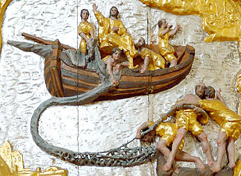 Doch wenn du es sagst, werde ich die Netze auswerfen. Das taten sie, und sie fingen eine so große Menge Fische, dass ihre Netze zu reißen drohten. Deshalb winkten sie ihren Gefährten im anderen Boot, sie sollten kommen und ihnen helfen. Sie kamen, und gemeinsam füllten sie beide Boote bis zum Rand, so dass sie fast untergingen.