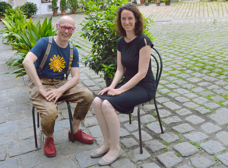 Johannes Gutmann kommt in seiner berühmten Lederhose zum radio klassik Stephansdom-Sommergespräch.