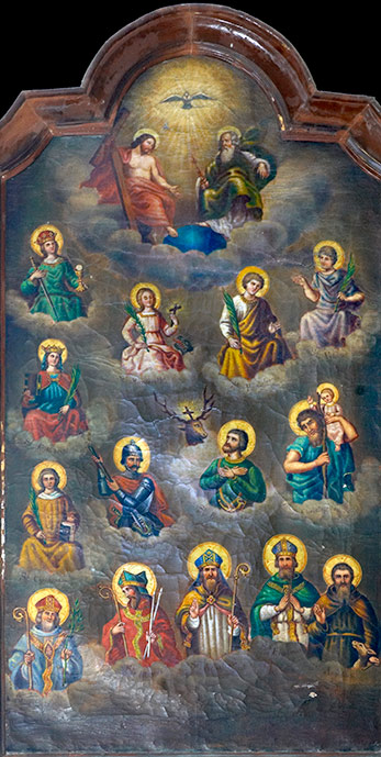 Die vierzehn Nothelfer sind vierzehn Heilige aus dem zweiten bis vierten Jahrhundert. Die Gruppe besteht nach der sogenannten Regensburger Normalreihe aus drei weiblichen und elf männlichen Heiligen, wobei alle bis auf den hl. Ägidius als Märtyrer starben.