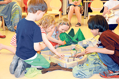 Im Palaiskindergarten St. Stephan, dem Betriebskindergarten der Erzdiözese Wien, drehte sich in der „Langen Nacht der Kirchen" alles um Noah und seine Arche. Kindergartenleiterin Karin Lehner und Kindergartenpädagogin Yvonne Bildsteiner ließen gemeinsam mit den Kindern mit Tüchern, Bausteinen und Holztieren die Geschichte so richtig lebendig werden. Da wurde stellvertretend für alle Tiere, die auf die Arche kamen, gemuht und gemäht und mit den Händen auf den Boden getrommelt, um den immer stärker werdenden Regen nachzuahmen.