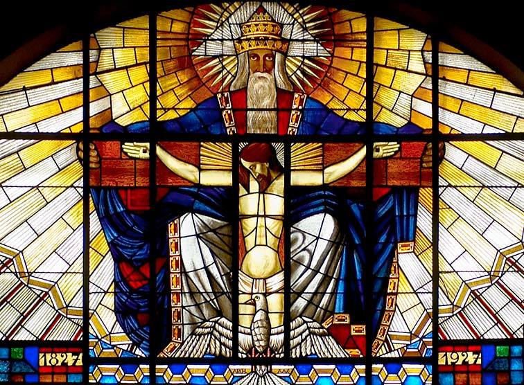 Gott-Vater präsentiert seinen Sohn Jesus Christus den Menschen als denjenigen, der für ihre Sünden am Kreuz gestorben ist. Der Heilige Geist ist als dritte Person das Band zwischen Gott-Vater und Gott-Sohn. – Der heilige Patrick soll einst den Iren die Dreifaltigkeit mit einem Kleeblatt, seither neben der Harfe das Symbol der Insel, erklärt haben.