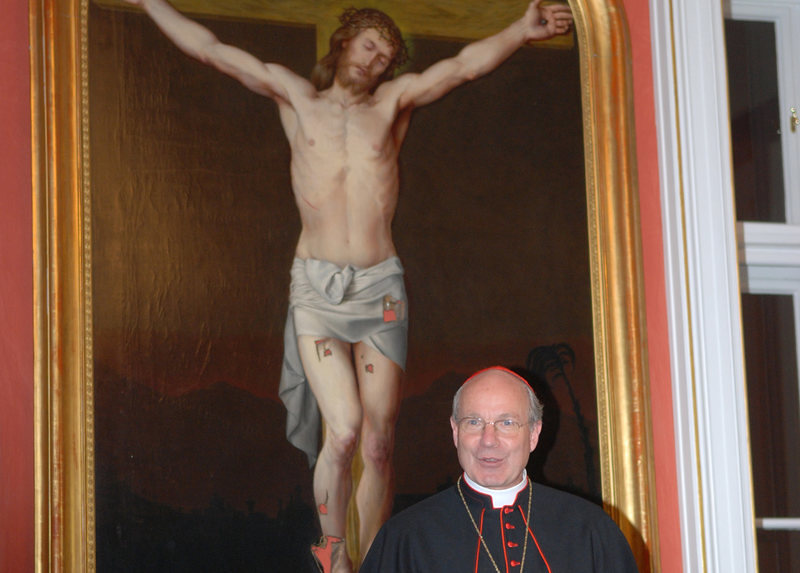 Kardinal schönborn steht unter jenem Kreuz, dass die Schergen der HJ beim Überfall aufs erzbischöfliche Palais zerstört hatten.