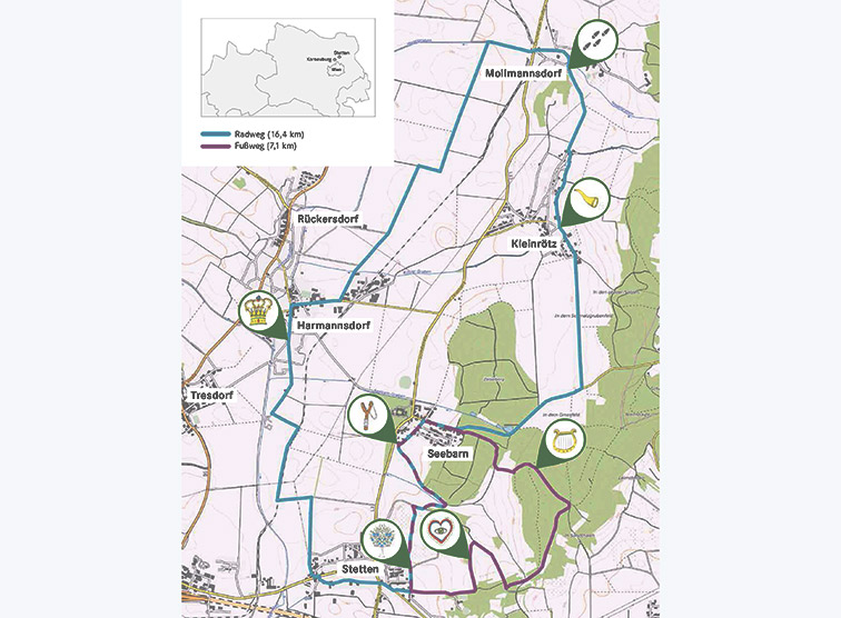 Der Bibelweg besteht aus sieben Stationen in den Orten Stetten, Harmannsdorf-Rückersdorf, Mollmannsdorf, Kleinrötz und Seebarn.
